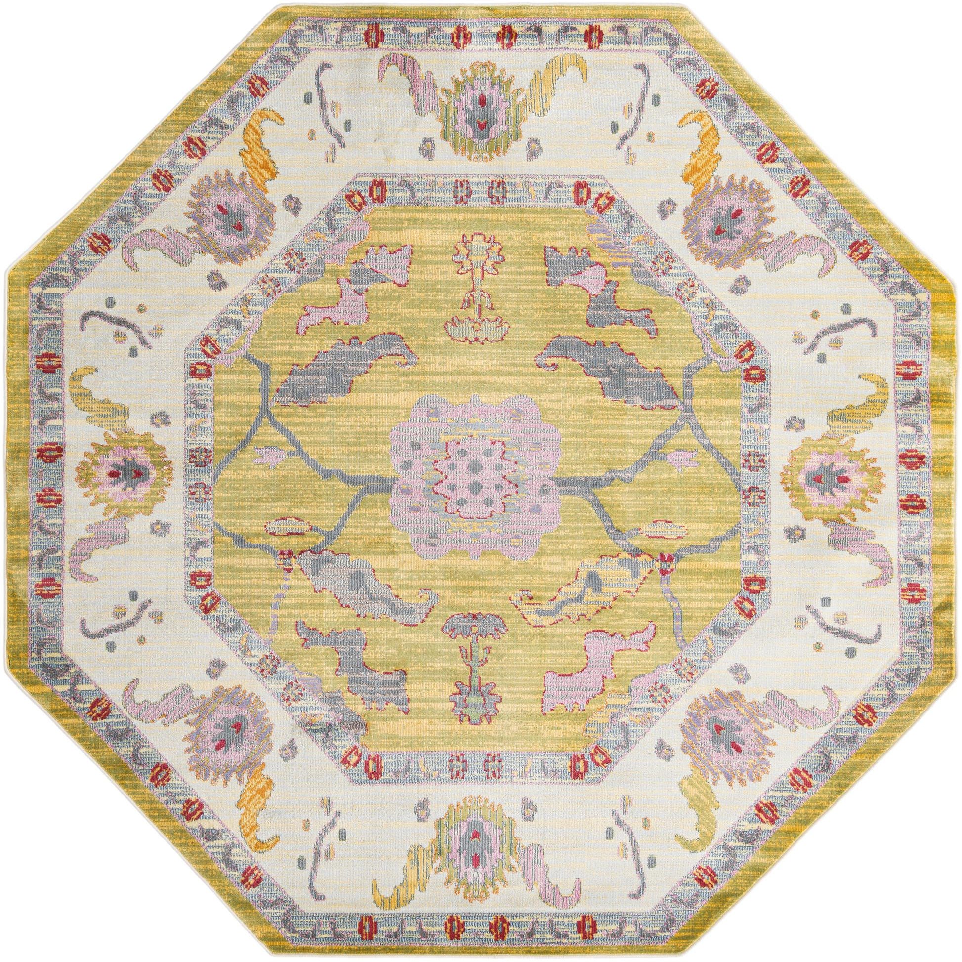 Machine made of 100% polypropylene, the rug has a low-profile, smooth surface that feels pleasant underfoot and holds the pattern clearly. Its blend of colors and classic motifs works well under a round dining table or in a foyer, and it also sits nicely beneath a pedestal coffee table in a cozy conversation nook. Pair it with soft gray walls and navy or light-blue upholstery for a calming scheme, or mix it into a more eclectic setting with warm wood furniture and brass accents to highlight the yellow, orange and pink details.