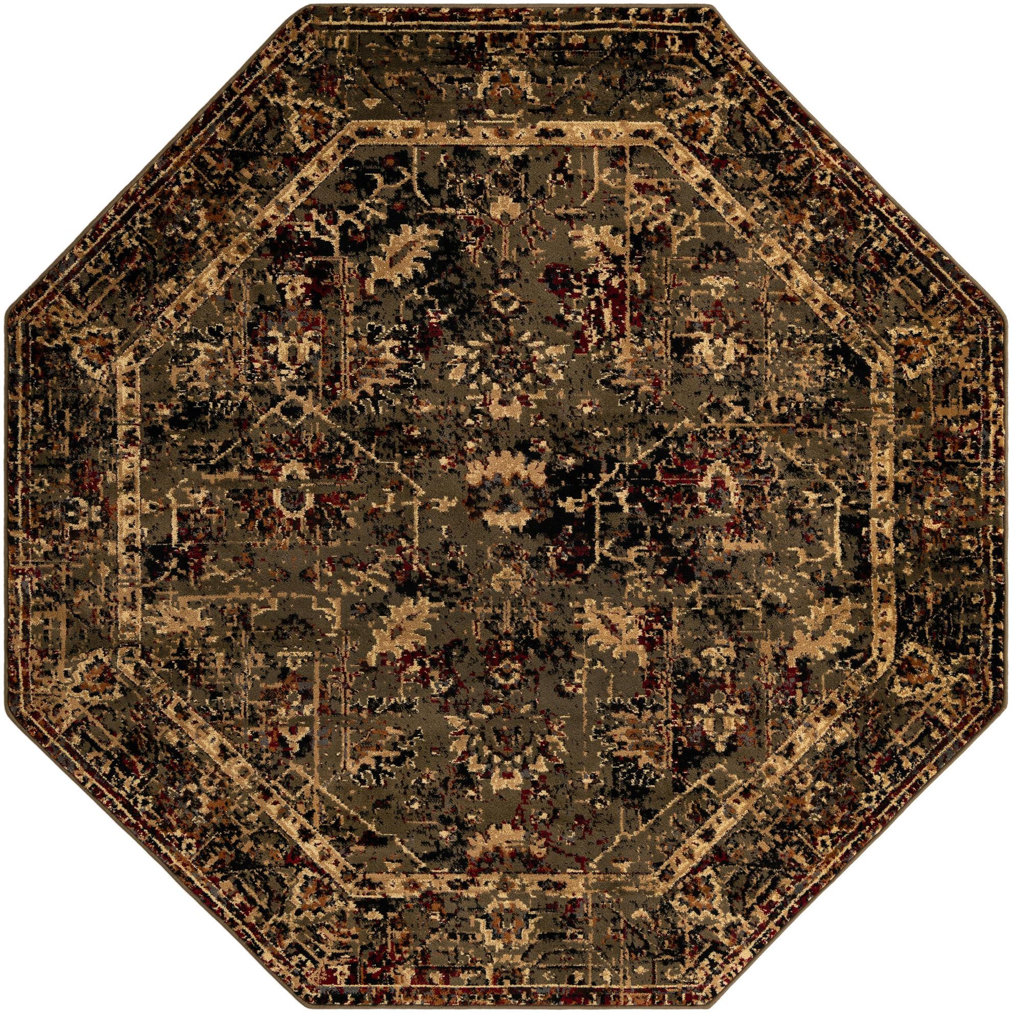 An octagonal rug with a traditional, distressed oriental pattern rendered on a rich green ground. A soft beige border traces the octagon while floral and vine motifs in beige, black, and touches of red form a layered central field and corner detail. The machine-made construction in 100% polypropylene produces a low-profile surface with a smooth, slightly cushioned hand you can feel underfoot, and the subtly faded coloration gives the piece a lived-in, vintage character without heavy texture.