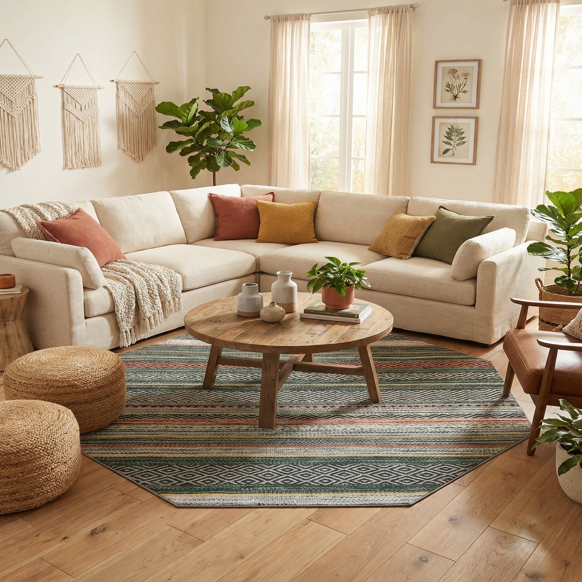 Octagon rug featuring a coastal stripe pattern in various shades of green, white, and orange, with geometric diamond and chevron accents.