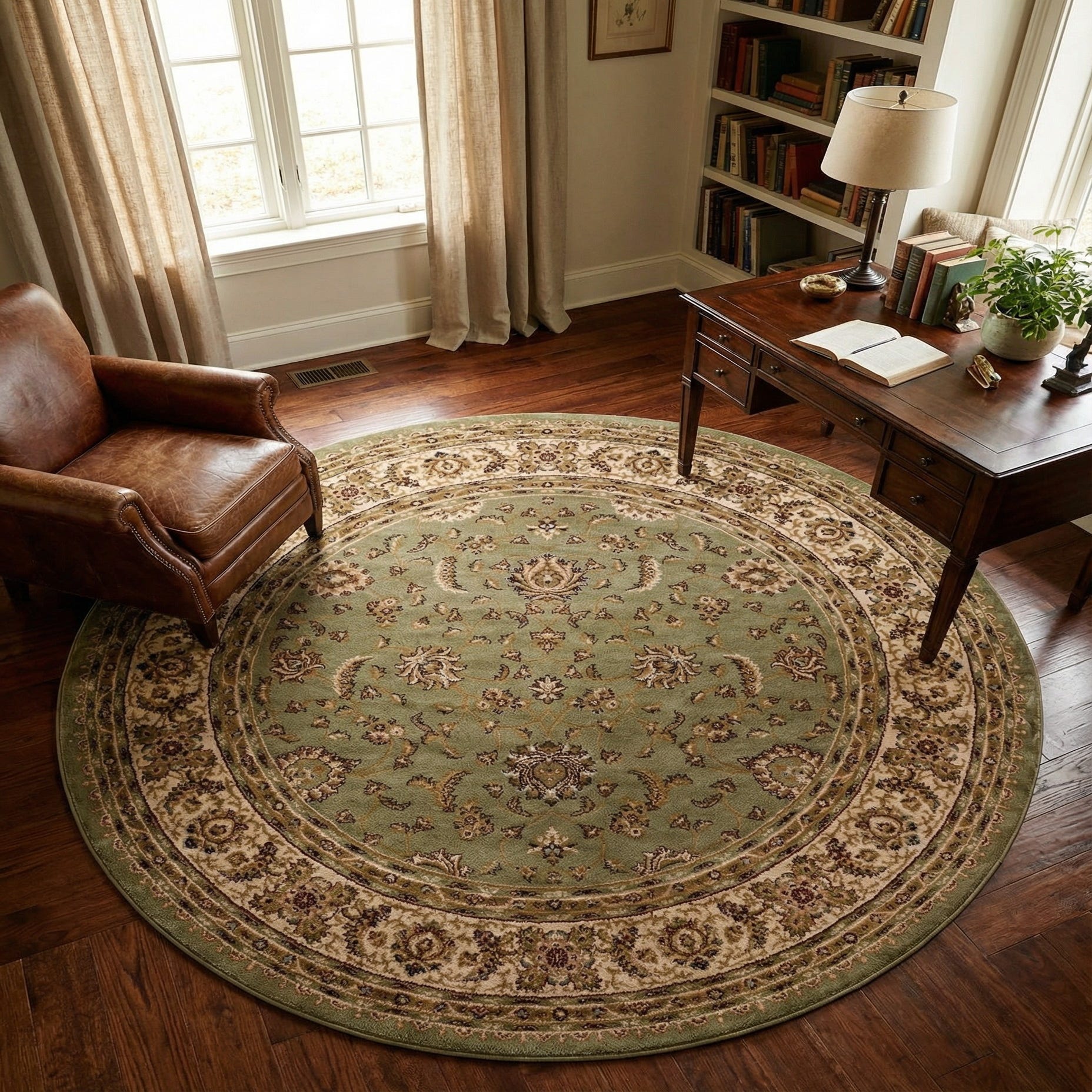 A traditional round rug with a classic floral-and-vine motif set on a green field, this piece has a balanced, symmetrical layout with scattered palmettes and scrolling foliage that lead toward a subtly defined center. The wide cream border frames the design with repeating floral cartouches, while accents of light blue, red and rust-red add measured pops of color against warm tan and brown detailing. Machine-made from 100% polypropylene, the pile has a low-to-medium profile with a smooth, even surface and a soft hand that still reads structured underfoot.