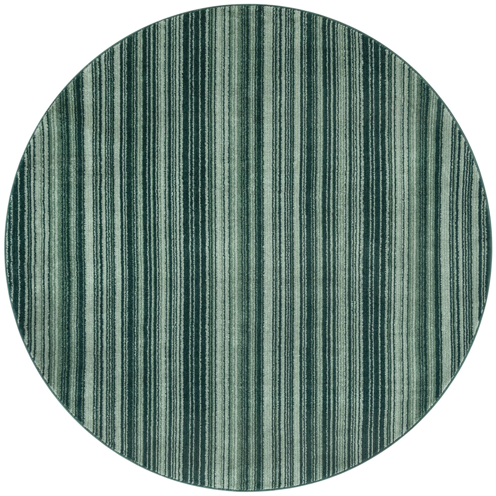 A round 7' 10 x 7' 10 green area rug with varying vertical stripes of light and dark green, suitable for a patio.