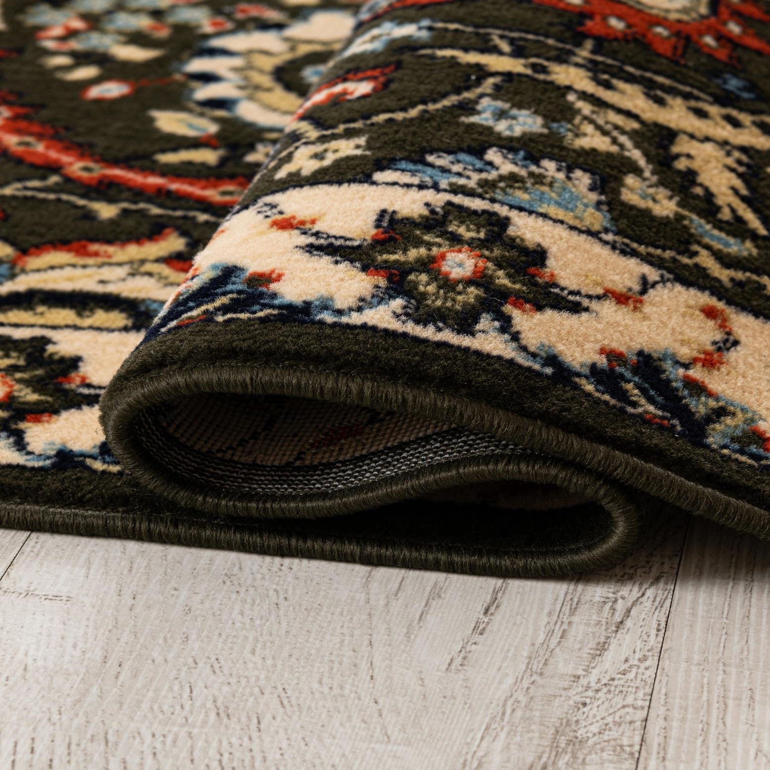 Primary color is Green. Colors in this rug include: Green, Black, Blue, Cream, Terracotta.