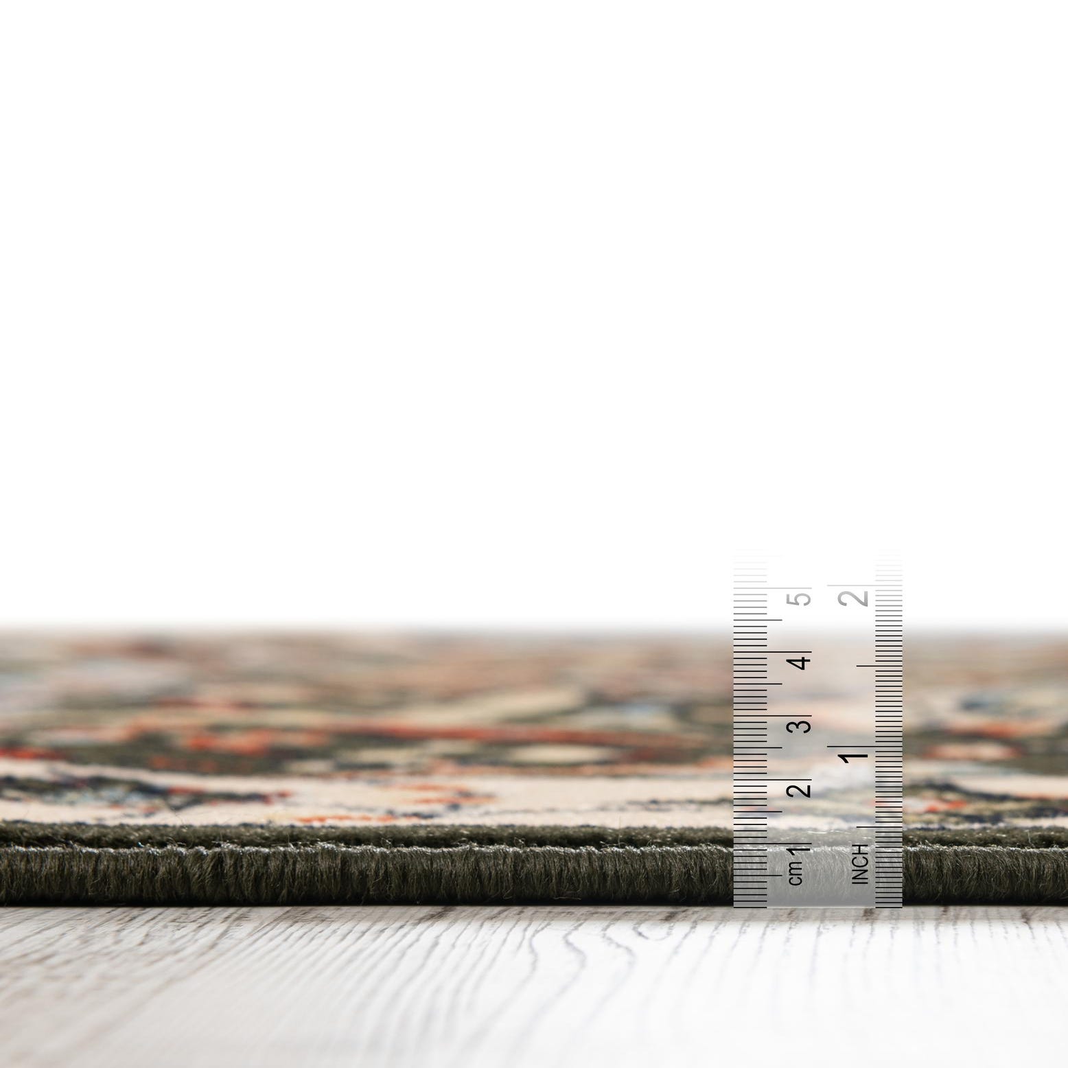 Machine-made of 100% polypropylene, the surface has a low, dense pile that feels smooth and slightly cushioned underfoot while keeping the pattern crisp and well-defined. The round shape works well to anchor a circular dining table or to define a compact seating area in a living room; it also suits a foyer, study, or sunroom where you want a focused, decorative element. Pair it with warm wood furniture and leather for a traditional or transitional look, layer it over hardwood for a spirited contrast in a modern interior, or use it to introduce color into a neutral palette.