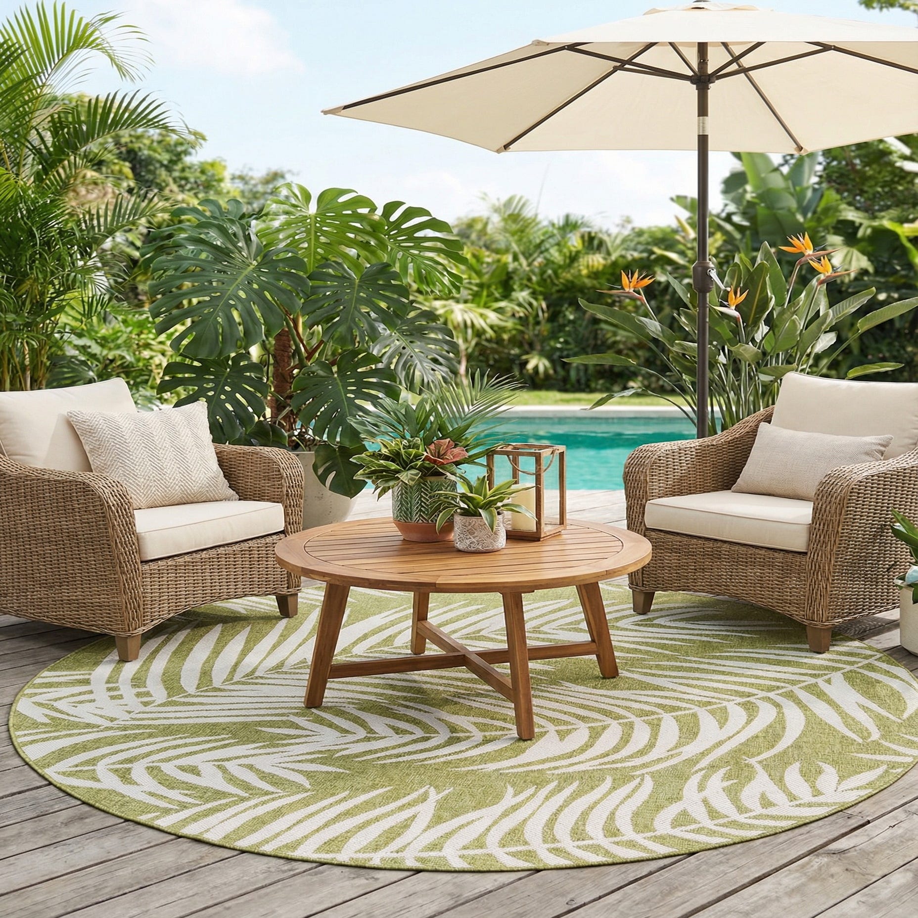 A round rug with a green background overlaid by oversized ivory palm fronds creates a relaxed, botanical look. The leaf silhouettes are arranged to suggest natural movement across the surface, and the contrast between the ivory shapes and the textured green field keeps the pattern clean and modern without feeling fussy. The overall effect leans casual and contemporary, suited to both indoor and sheltered outdoor spaces.