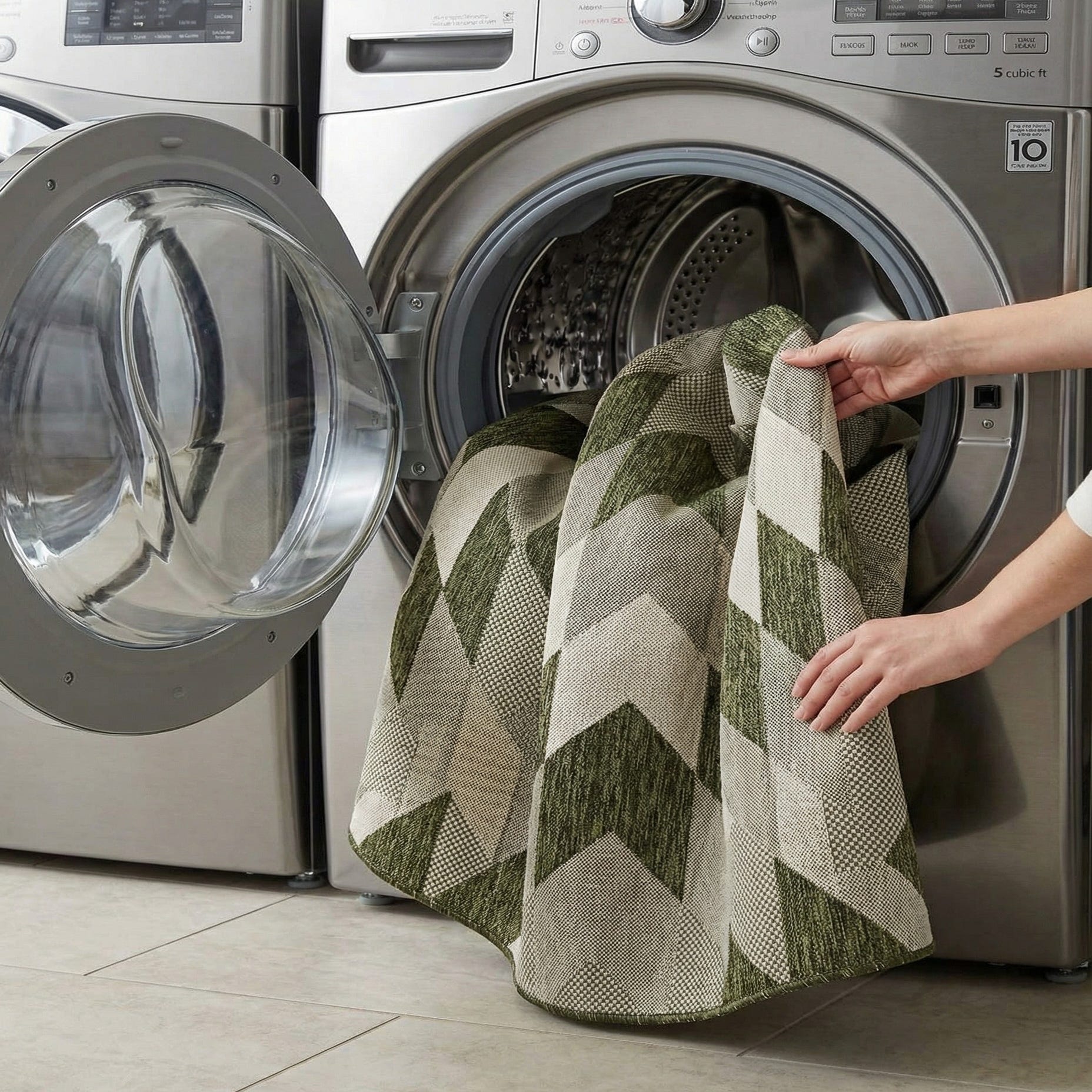 This round shape works well beneath a bistro table on a covered patio, centered under a circular dining set on a screened porch, or as an anchoring layer in a sunroom or modern conservatory. Pair it with natural woods like teak or oak, white or ivory cushions and planters, and streamlined metal accents to reinforce the modern look while letting the green background bring a fresh, grounded touch to the space.