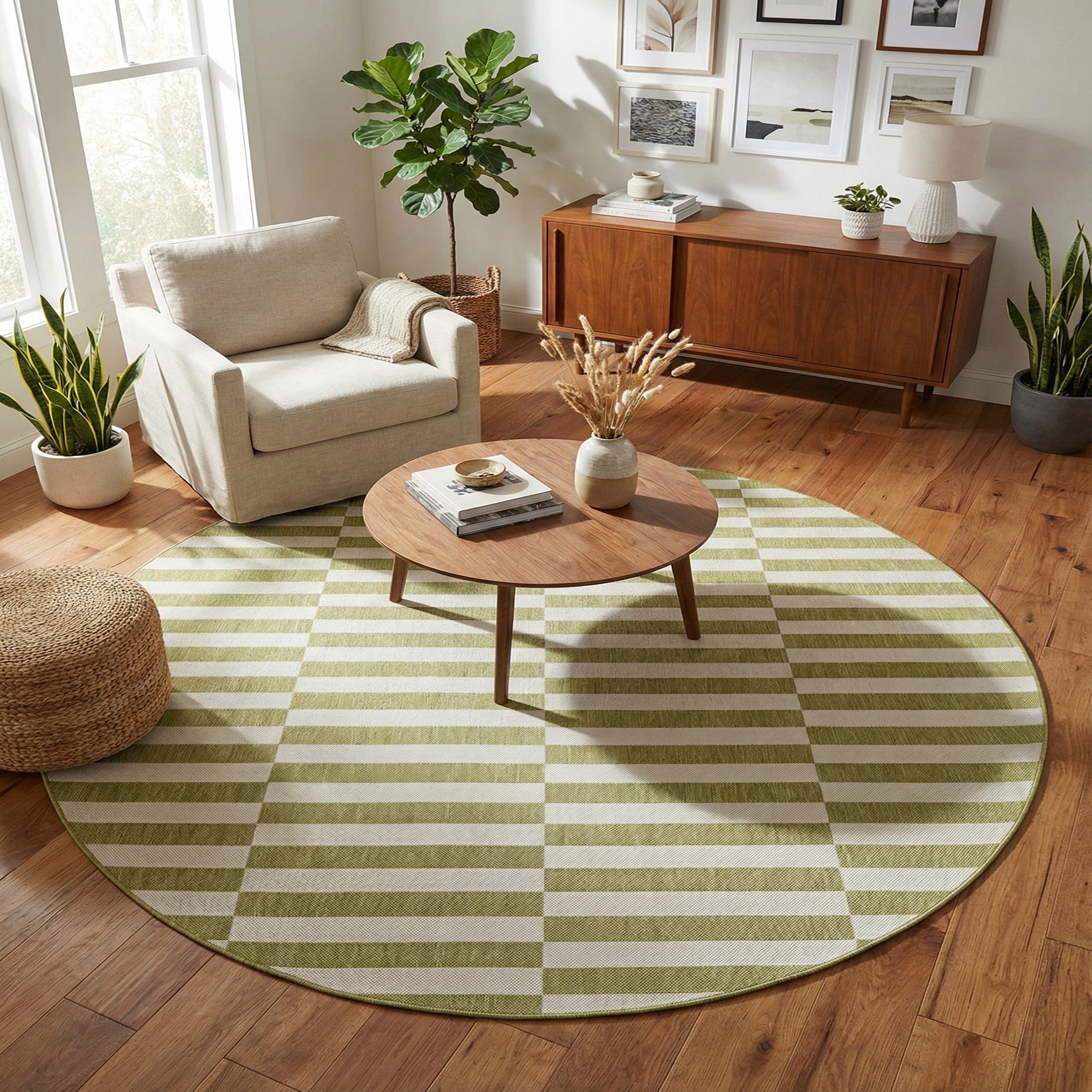A crisp, graphic stripe gives this round rug a modern, tailored look. The green ground is crossed by evenly spaced ivory bands that form stacked, ribbon-like columns across the surface, creating a balanced, rhythmic pattern. Machine-made from 100% polypropylene, the weave is low-profile and tightly constructed — firm underfoot with a subtle textured hand that lays flat beneath furniture.