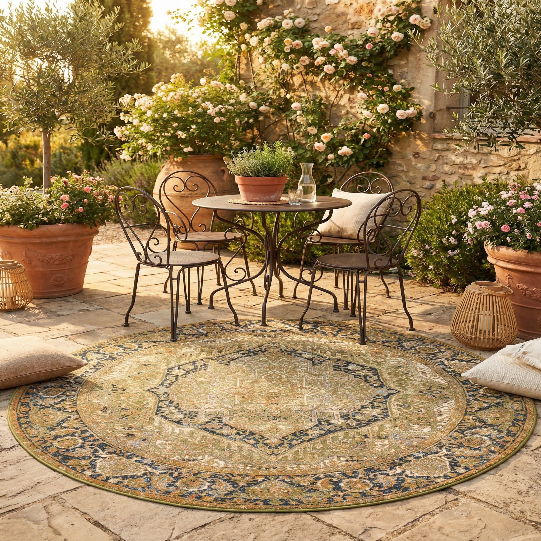 This 8 Ft Round rug presents a classic design that can seamlessly integrate into various decor styles. Whether placed under outdoor seating for a sophisticated patio setting, used in a sunroom for a touch of elegance, or incorporated into a casual dining area, this rug's traditional pattern and colors effortlessly complement timeless and transitional interiors.