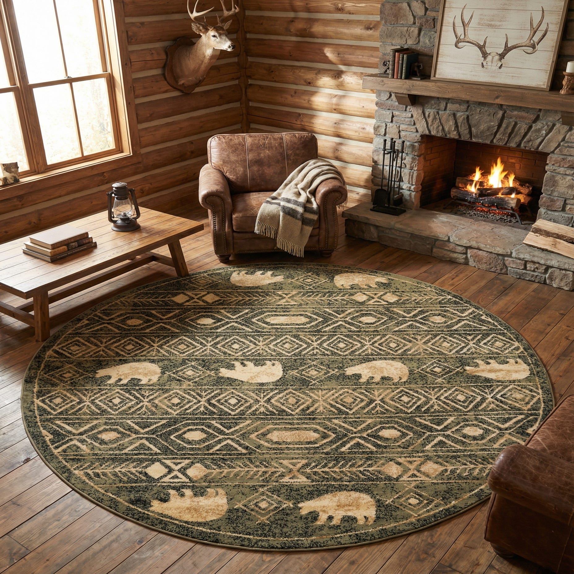 A banded, lodge-inspired pattern gives this round rug a relaxed, rustic character. The green background provides a muted field for rows of geometric motifs in black and brown, interrupted by ivory bear silhouettes that punctuate the design with a playful, nature-driven touch. A lightly distressed, speckled finish softens the contrasts and creates depth across the surface. Machine-made from 100% polypropylene, the rug has a low, dense pile that feels smooth underfoot while holding its shape and pattern clearly.