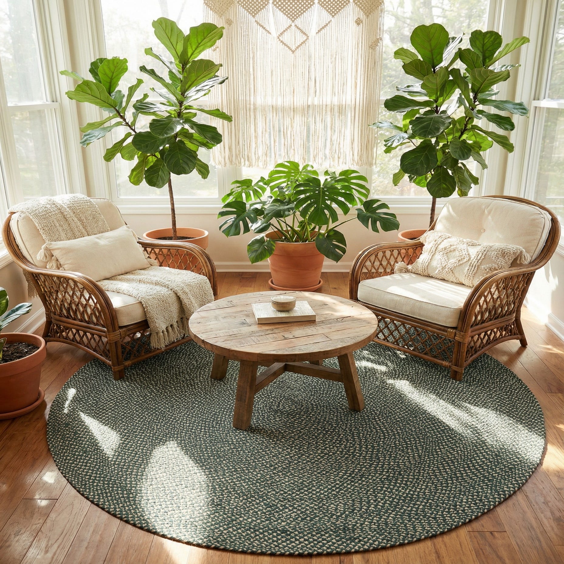 The rug’s casual, organic look complements a range of interiors: place it beneath a round dining table or in a breakfast nook for a relaxed, grounded anchor; tuck it under a seating group in a coastal or cottage-style living room; or layer it in a sunroom with rattan or wicker furniture to amplify a warm, natural palette. Its muted mix of green, gray, and ivory pairs well with linen upholstery, weathered wood, and soft metallic accents.
