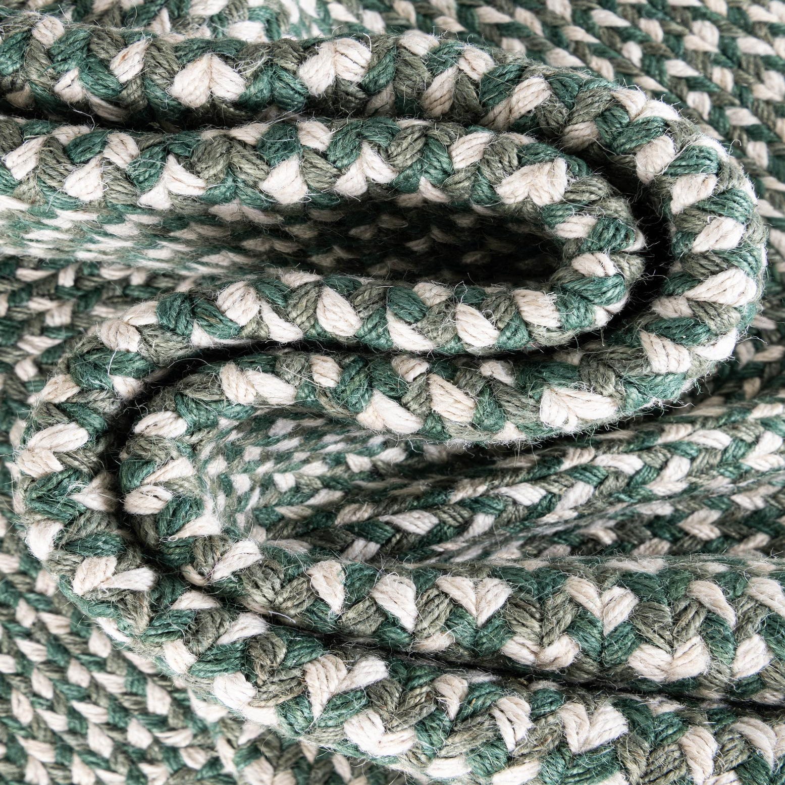 Hand-braided from 100% jute, this round rug shows a tight concentric braid with a subtle flecked weave. The green background is woven with gray and ivory fibers to create a low-contrast, speckled effect that feels calm and natural. The braided construction produces gentle rings across the surface and a tactile, slightly coarse texture—you can feel the natural jute fibers underfoot and see the dimensional weave up close.