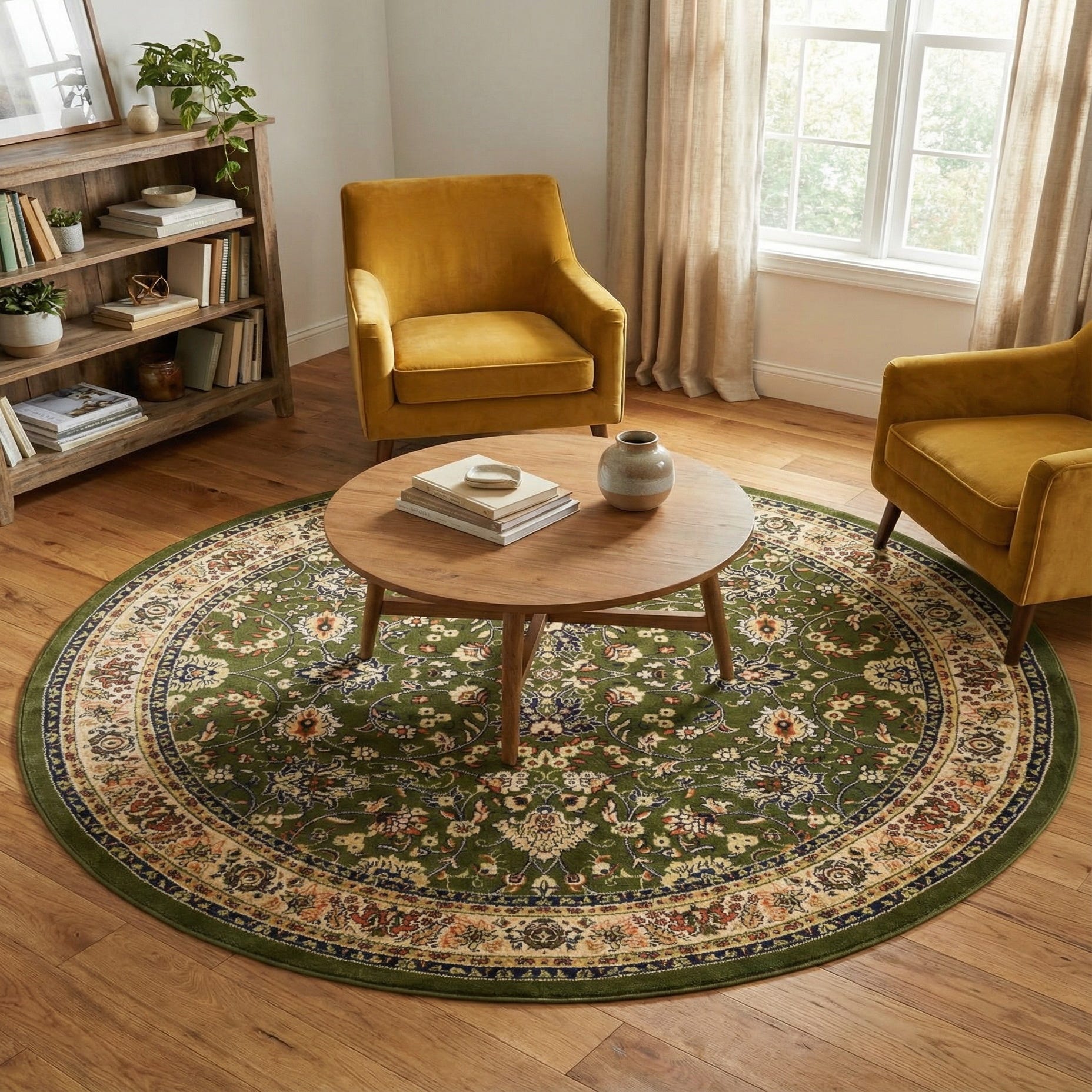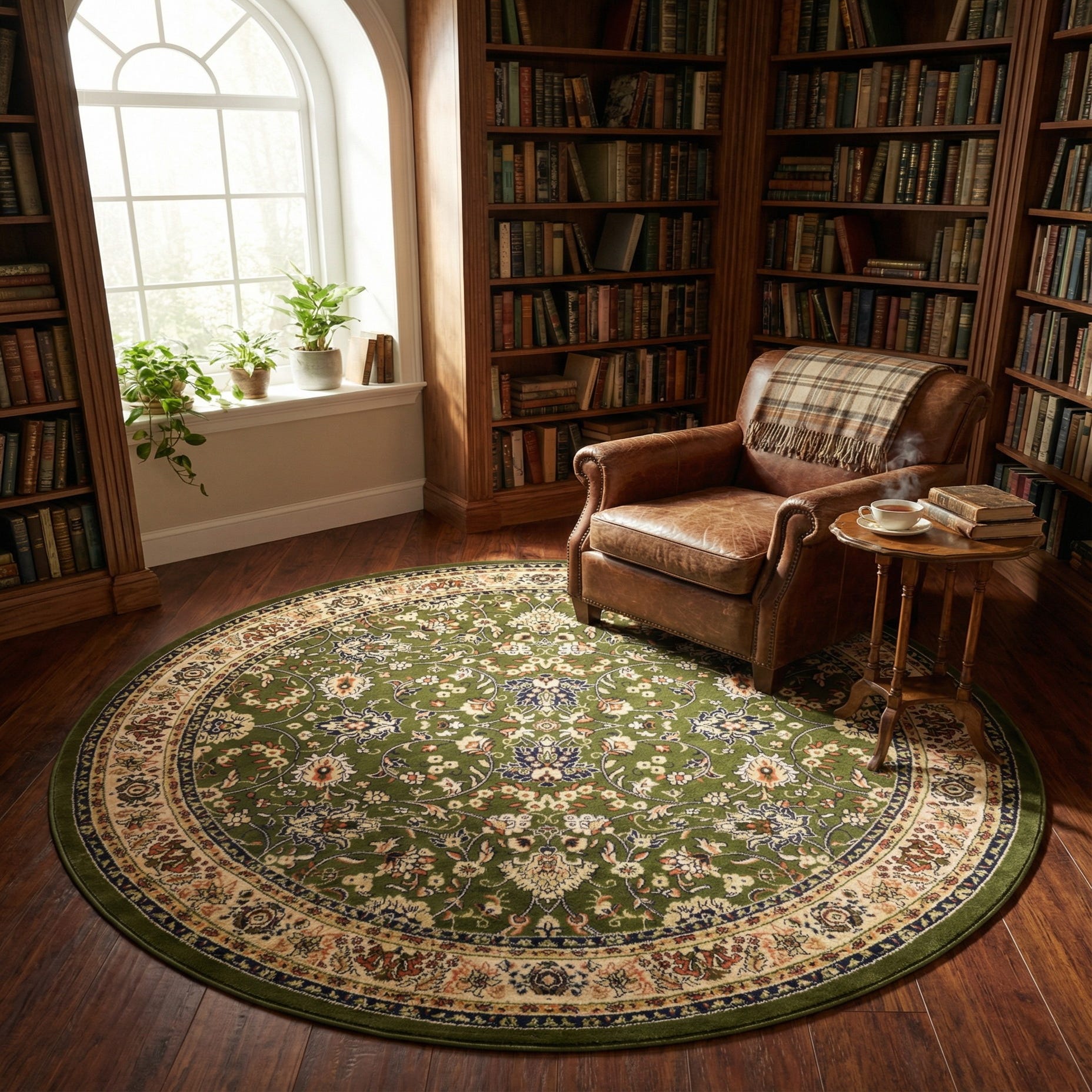 Machine made of 100% polypropylene, the rug has a low, dense pile that feels smooth and slightly springy underfoot with a soft, subtle sheen. The construction provides a consistent surface that layers well beneath a round table, anchors a seating group, or adds definition to a cozy reading nook. Pair it with warm wood tones, leather or neutral upholstery for a traditional or transitional scheme, or let the green ground bring color to a cottage or farmhouse-inspired interior.