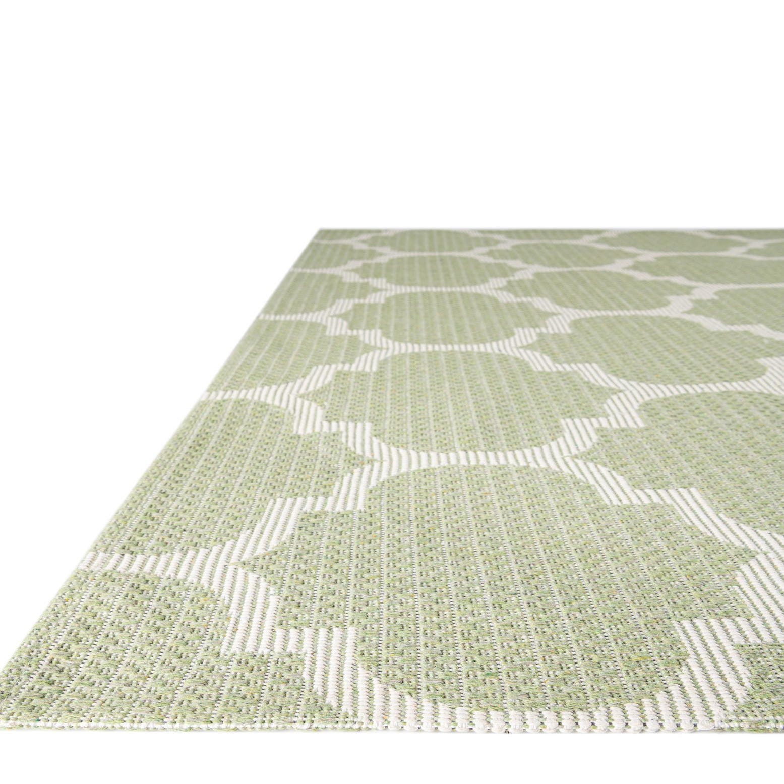 A repeating Moroccan-inspired trellis pattern in soft ivory sits evenly across a green background, creating a clean, geometric look with subtle textural interest. Machine-made from 100% cotton, the weave has a low profile and a slightly nubby surface that feels substantial yet breathable underfoot. The ivory motif contrasts crisply with the green field while the cotton construction produces a matte, natural finish that layers well with other textiles.