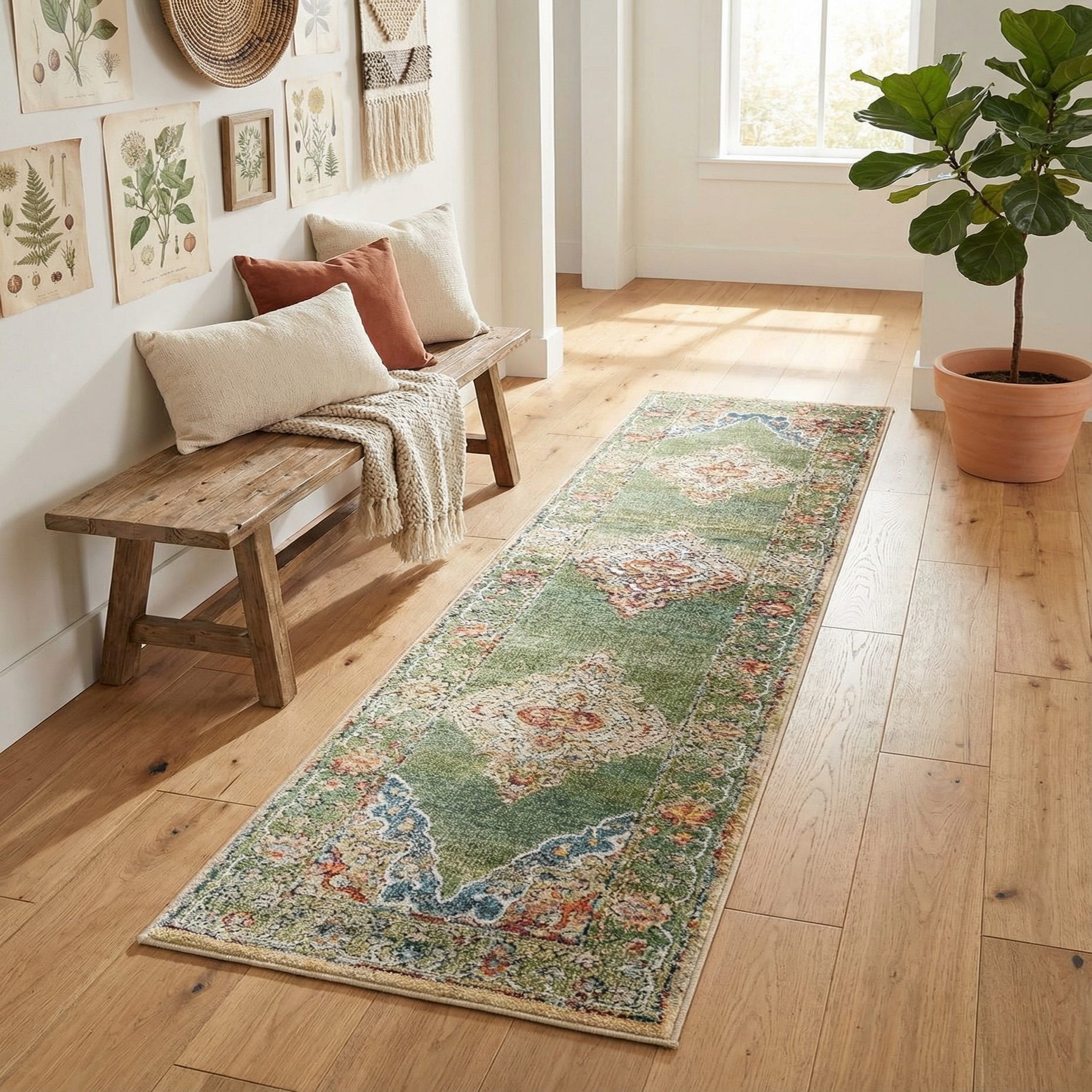Primary color is Green. Colors in this rug include: Green, Blue, Brown, Ivory, Olive, Beige, Black, Violet.