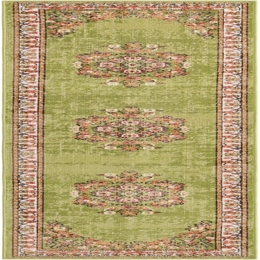 A traditional medallion runner with a fresh color palette, this rug centers three ornate floral medallions on a soft green field. A narrow ivory border punctuated with orange and rust-red floral accents frames the piece, while small leafy corner motifs add classic detail. Constructed of 100% polypropylene, the surface has a low-profile, dense weave that feels smooth and slightly cushioned underfoot while lying flat in high-traffic areas.