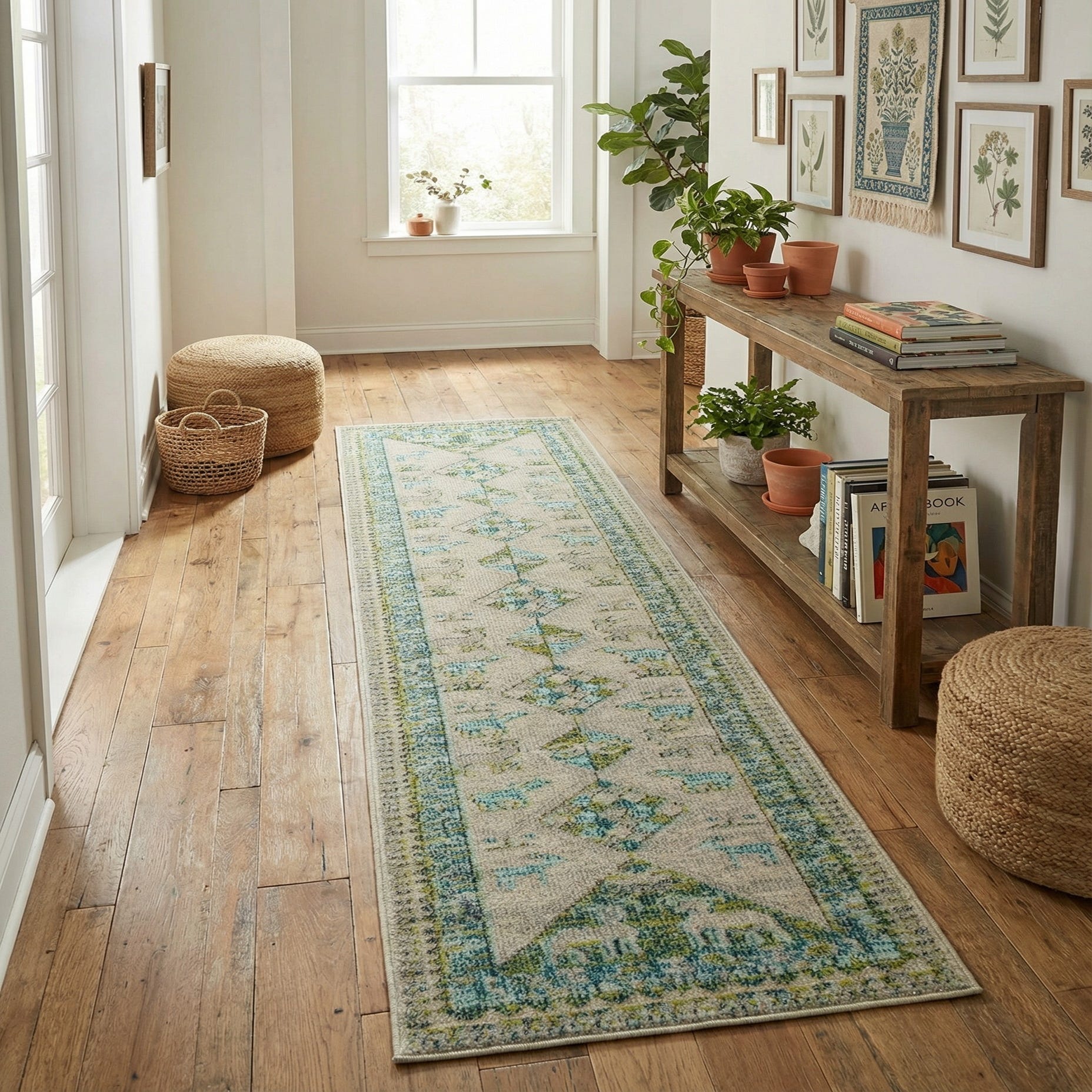 Primary color is Green. Colors in this rug include: Green, Gray, Ivory, Teal.