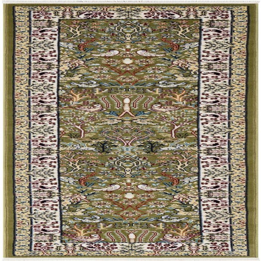 Primary color is Green. Colors in this rug include: Green, Black, Blue, Burgundy, Cream, Ivory, Navy Blue, Puce.