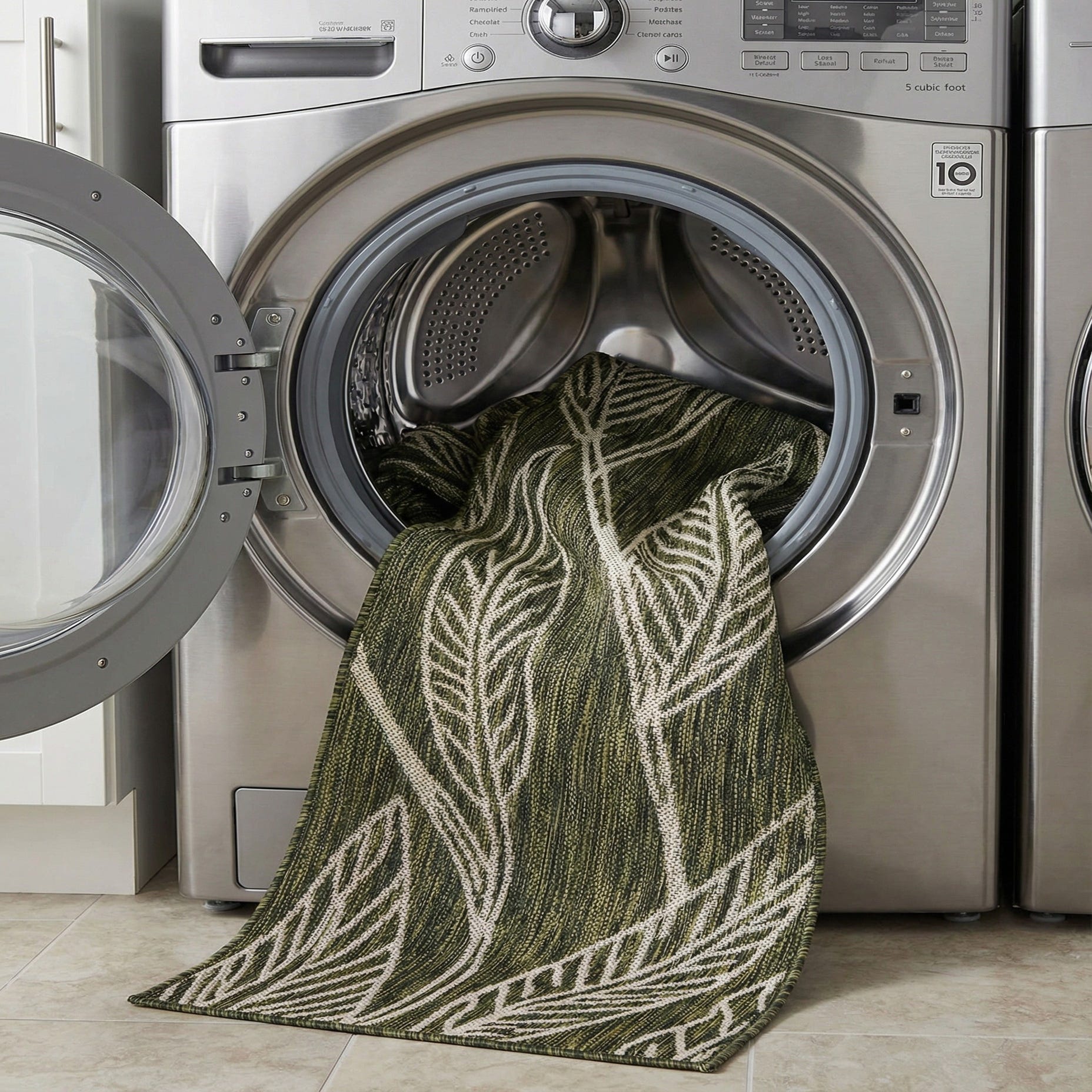 A green 8 ft runner rug with a modern botanical pattern of large, light-colored leaves and branches, suitable for indoor/outdoor use.