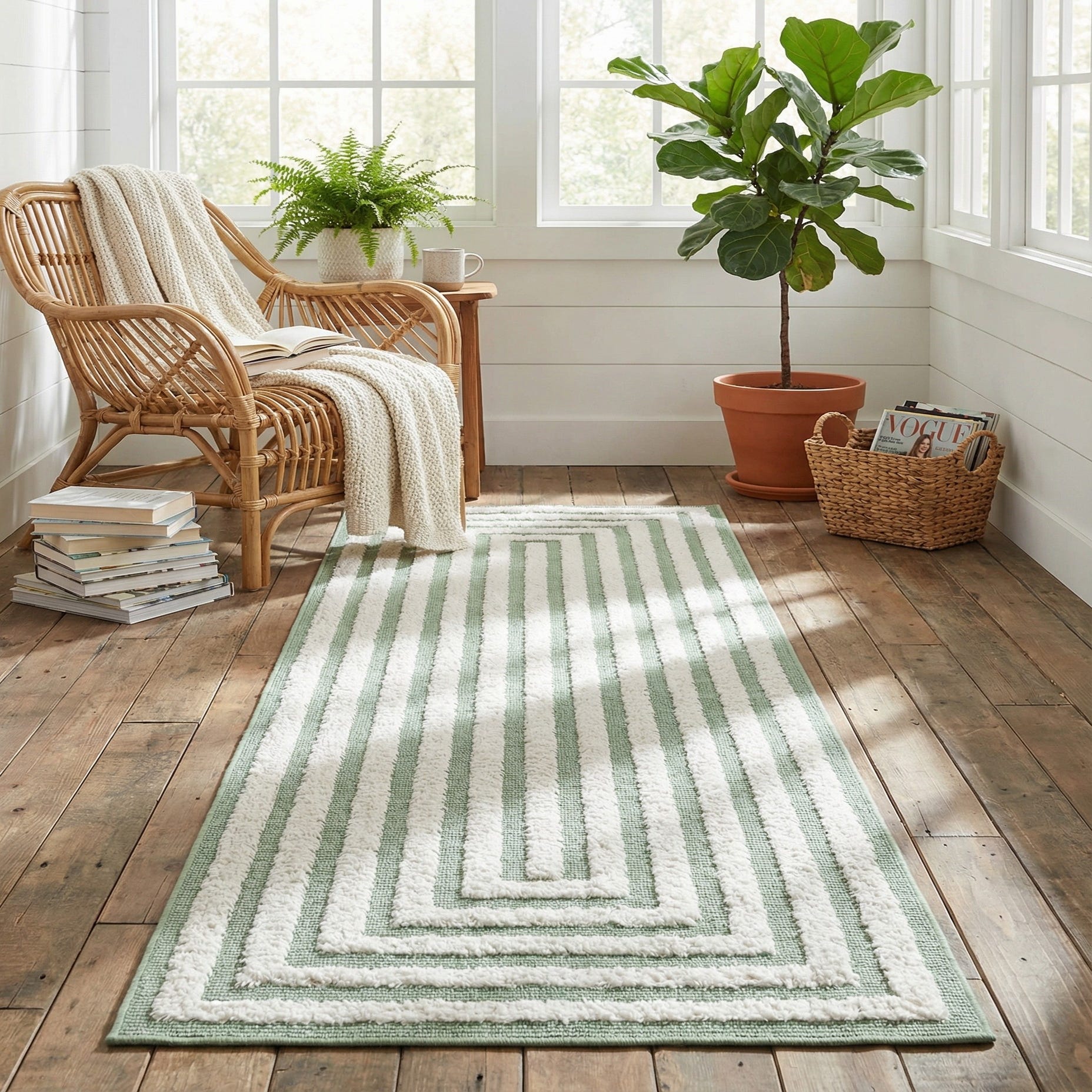 A green and white striped runner rug with a modern geometric pattern and textured pile, ideal for a hallway.