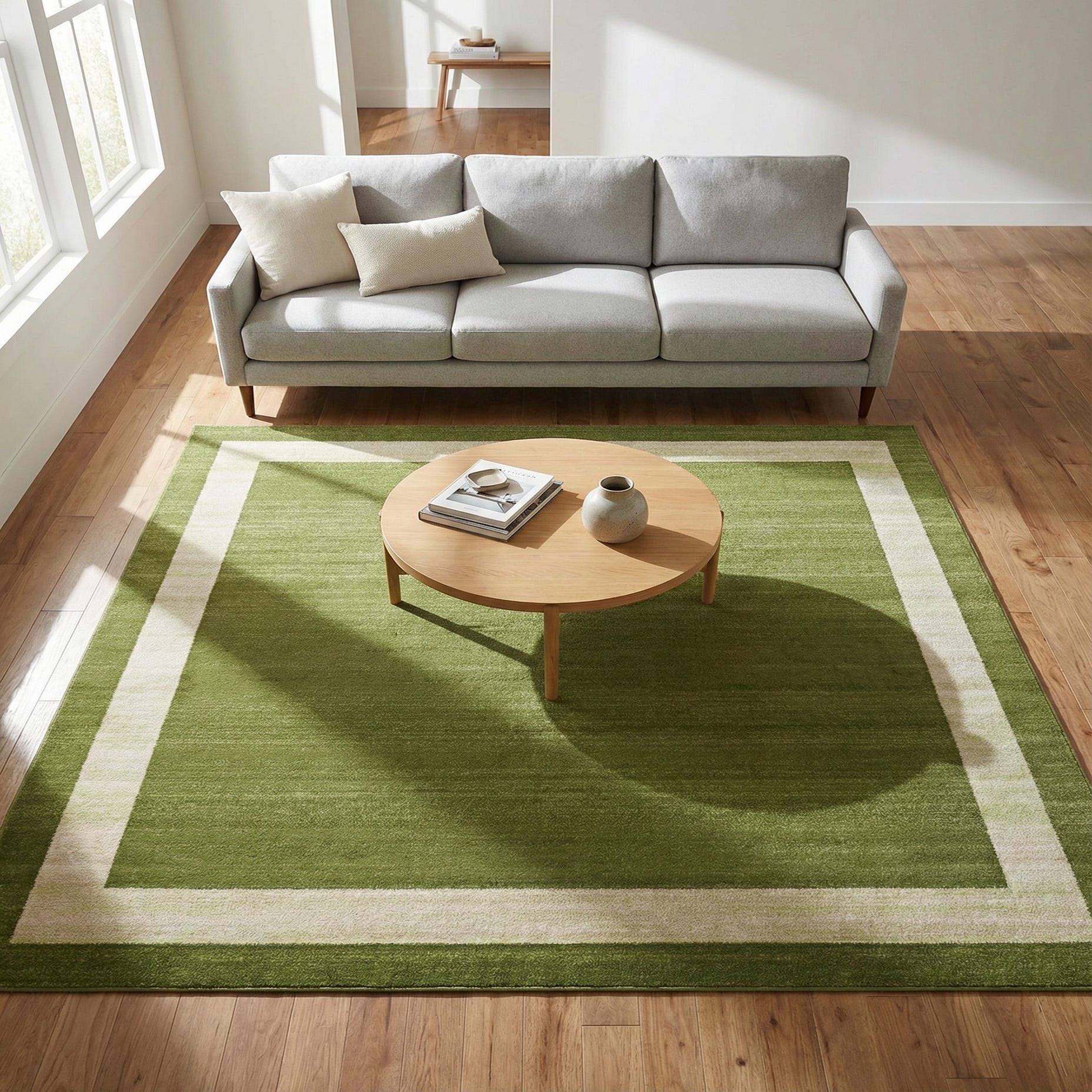 A clean, modern bordered design in a rich green background gives this rug a calm, grounded presence. A wide ivory inner border creates a crisp frame while a slightly darker green outer band completes the composition. The field shows subtle tonal variation that adds visual depth without pattern clutter, making the overall look intentionally restrained and contemporary.