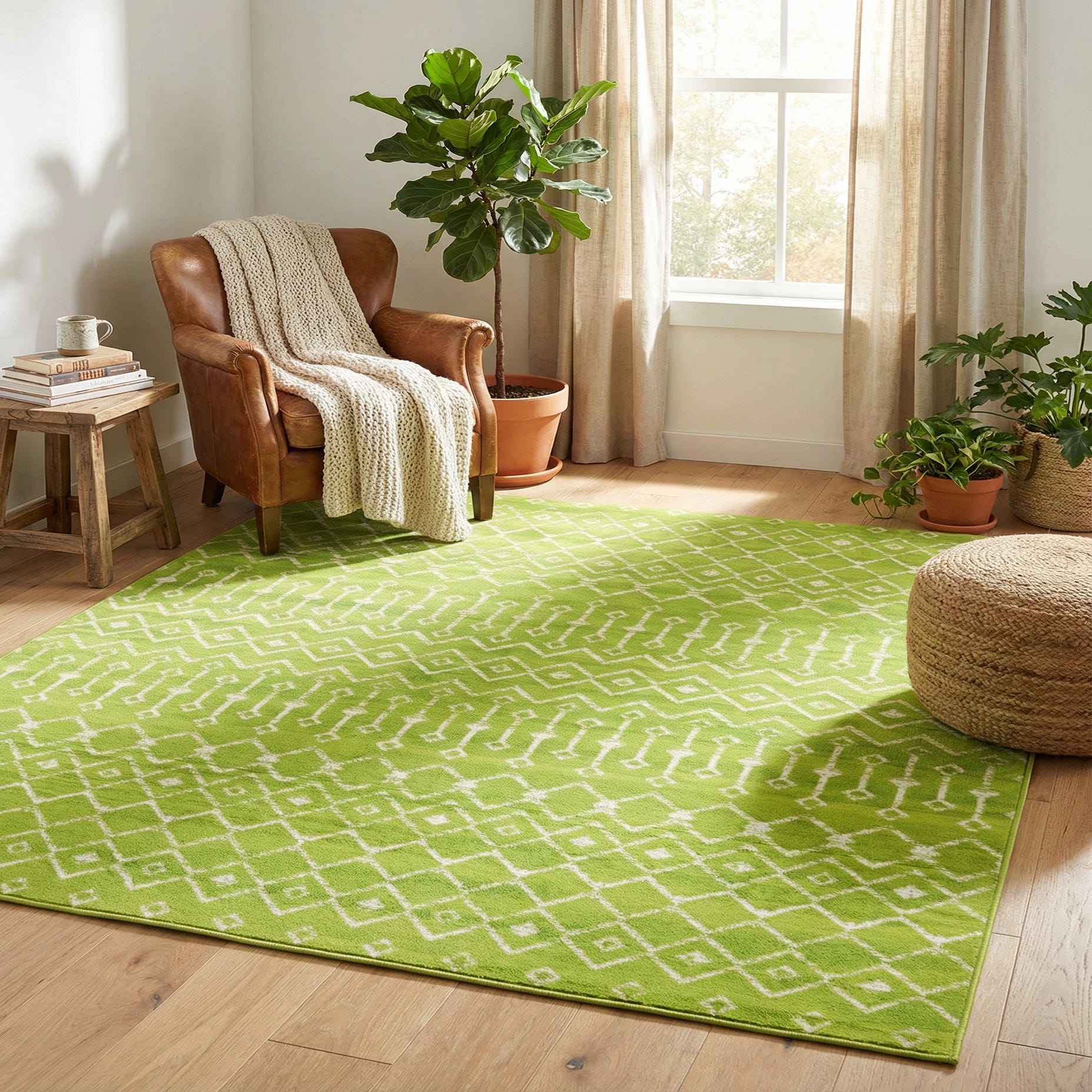 This piece fits well in casual, contemporary, or global-inspired interiors. Place it beneath a coffee table to anchor a conversation area, brighten a sunroom or playroom, or add a pop of color to a neutral dining space. It pairs nicely with natural wood tones, rattan or wicker accents, and light upholstery, and it can temper mid-century or Scandinavian schemes when used as a lively, geometric focal point.