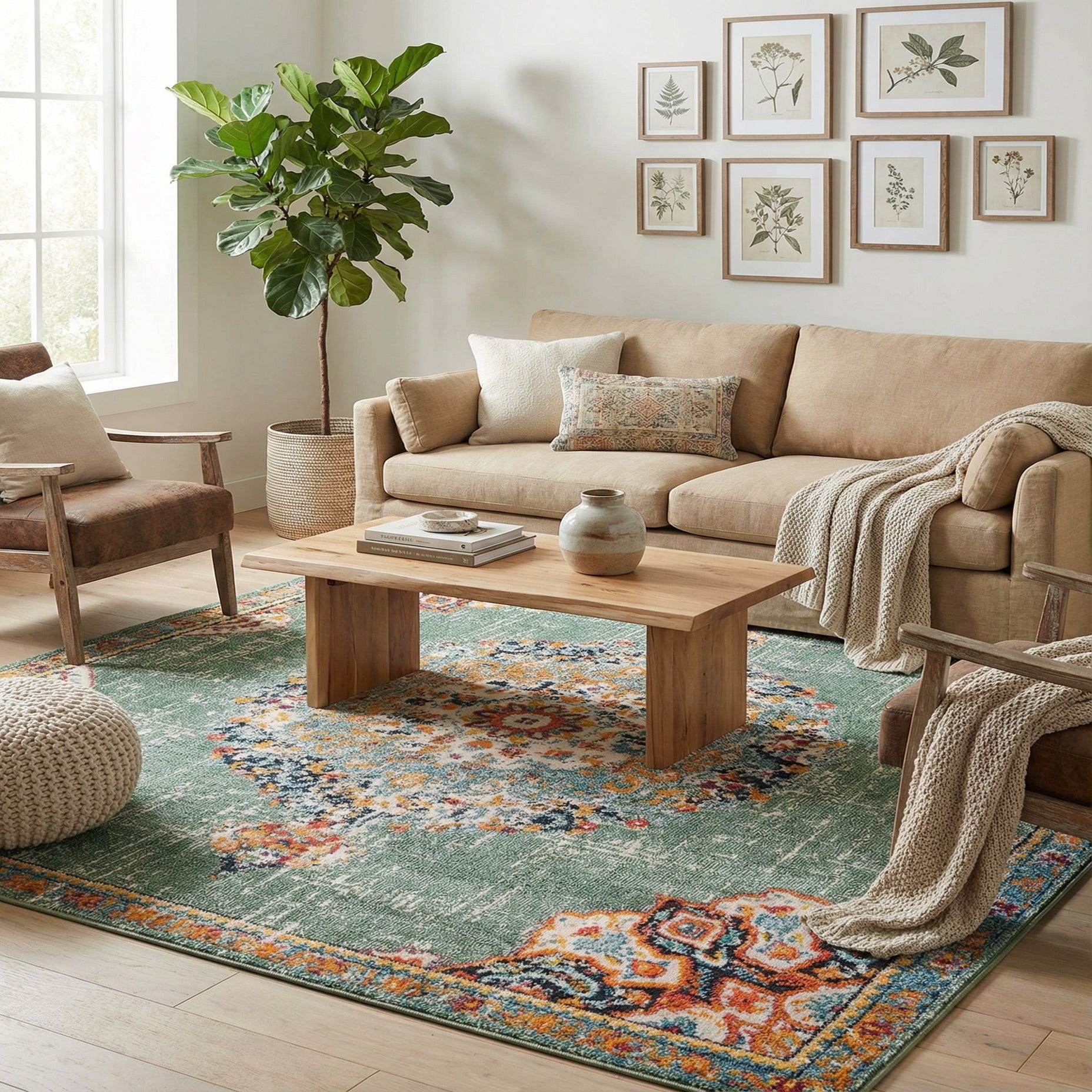 This piece anchors a variety of interiors — place it beneath a seating group to define the living area, layer it under a dining table to introduce color and pattern, or use it in a bedroom to add warmth and visual interest. It pairs well with mid-century and modern-traditional furniture, as well as eclectic or bohemian schemes that welcome mixed patterns and vibrant accents. The low-profile construction also makes it suitable for rooms with higher foot traffic or where furniture sits directly on the rug.