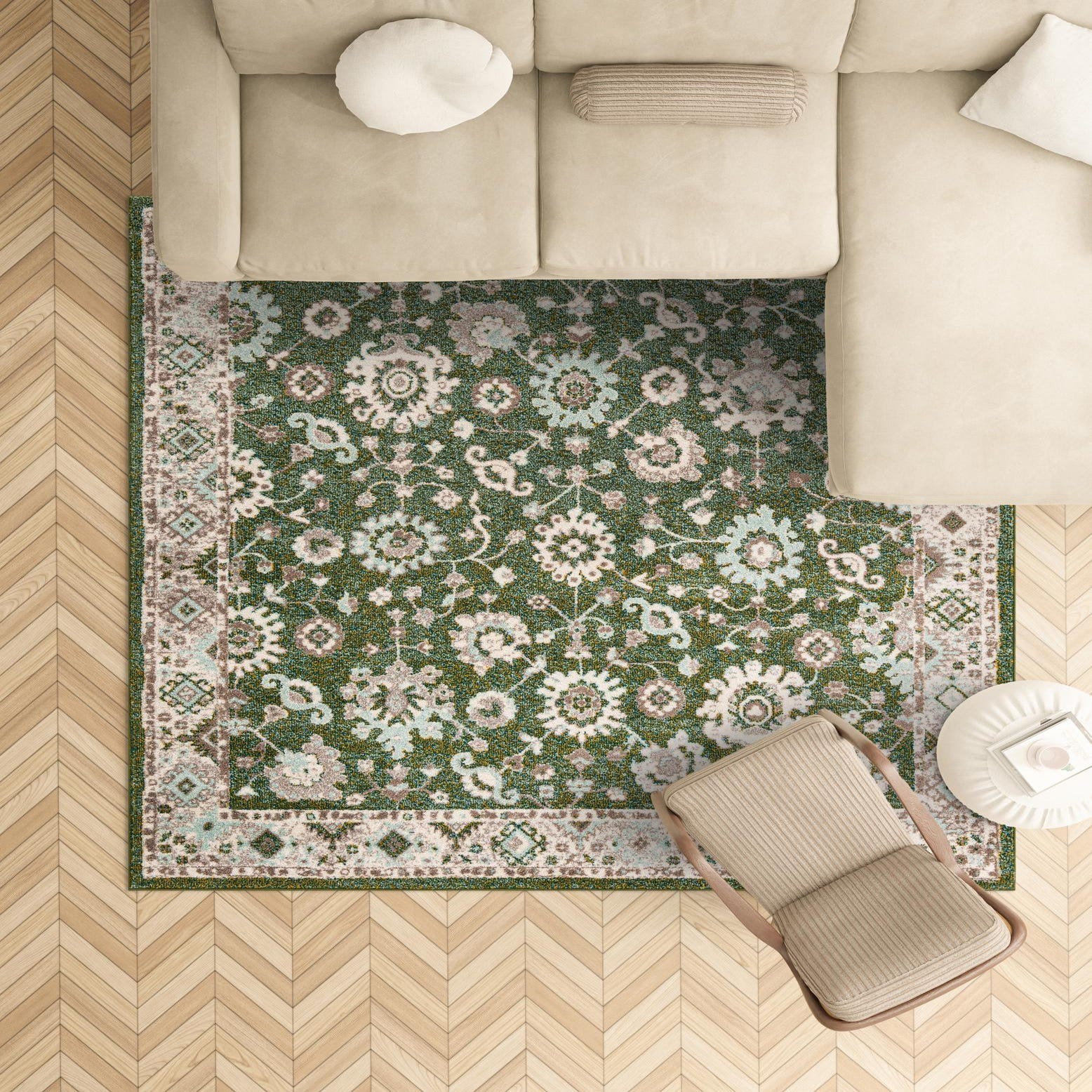 Primary color is Green. Colors in this rug include: Green, Beige, Ivory, Light Blue.