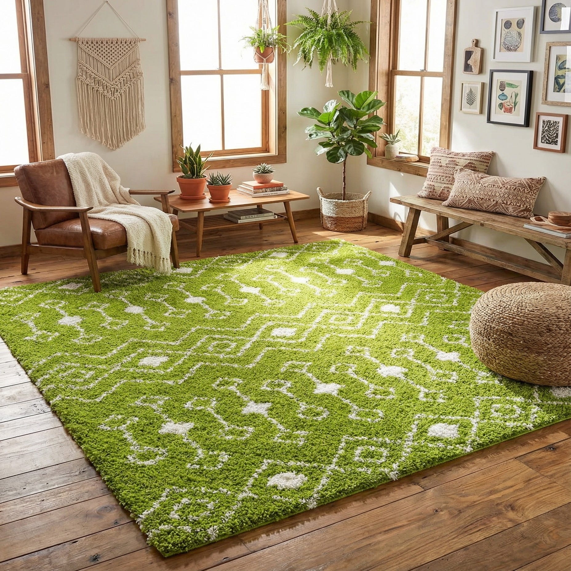 This rug brings a fresh, casual energy to living rooms, bedrooms, or cozy reading nooks. Use it to anchor a low-slung sofa in a contemporary or transitional space, layer it under neutral-toned furniture to introduce color, or place it in a playroom or kid’s room where soft texture enhances comfort. Pair with natural wood tones and light linens for a relaxed aesthetic, or combine with simple white and metallic accents for a more modern, graphic look.