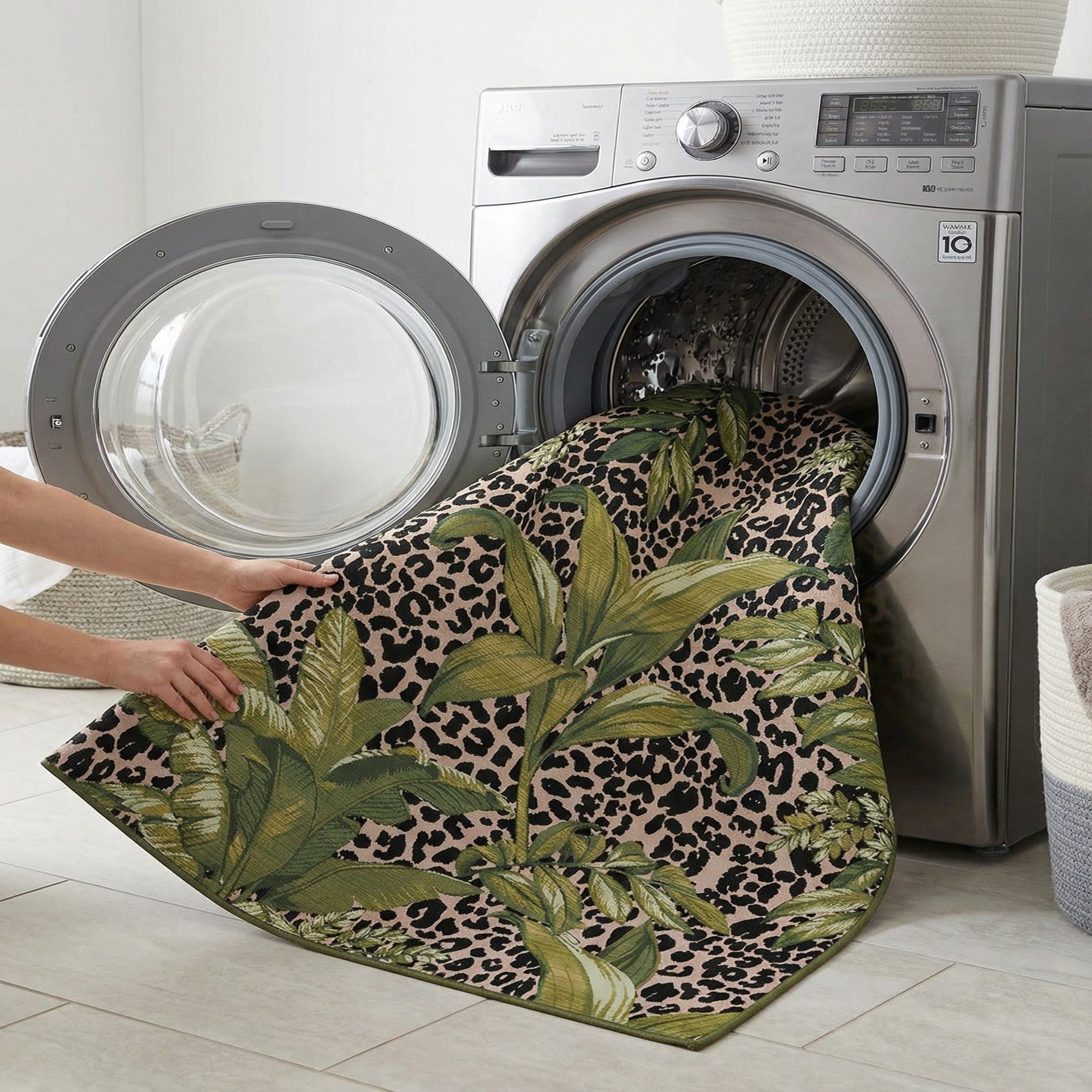 A 7' 10 x 7' 10 square rug featuring a bold green botanical leaf pattern over a beige and black leopard print background.