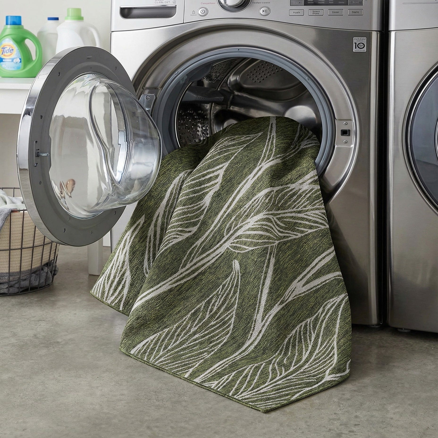 Ideal for outdoor living areas and sheltered patios as well as casual indoor spaces, this rug pairs naturally with rattan or wicker seating, warm wood furniture, and neutral linen cushions. Use it to anchor a sunroom seating set, define an al fresco dining area, or add a grounded, botanical touch to a mudroom or entryway while coordinating with leafy plants and muted gray accents.