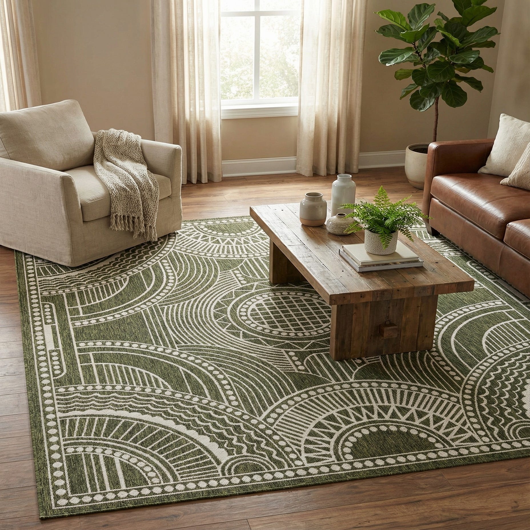 A strong, graphic medallion pattern in ivory sits against a green ground, laid out in concentric arches, dotted borders and scalloped linear details that give the rug an architectural, almost retro-modern feel. The pattern is crisp and well-defined, with the ivory motifs slightly raised against a low-profile, tightly woven face. Machine-made from 100% polypropylene, the surface has a firm, textured hand that holds its shape and keeps the design reading clearly underfoot.
