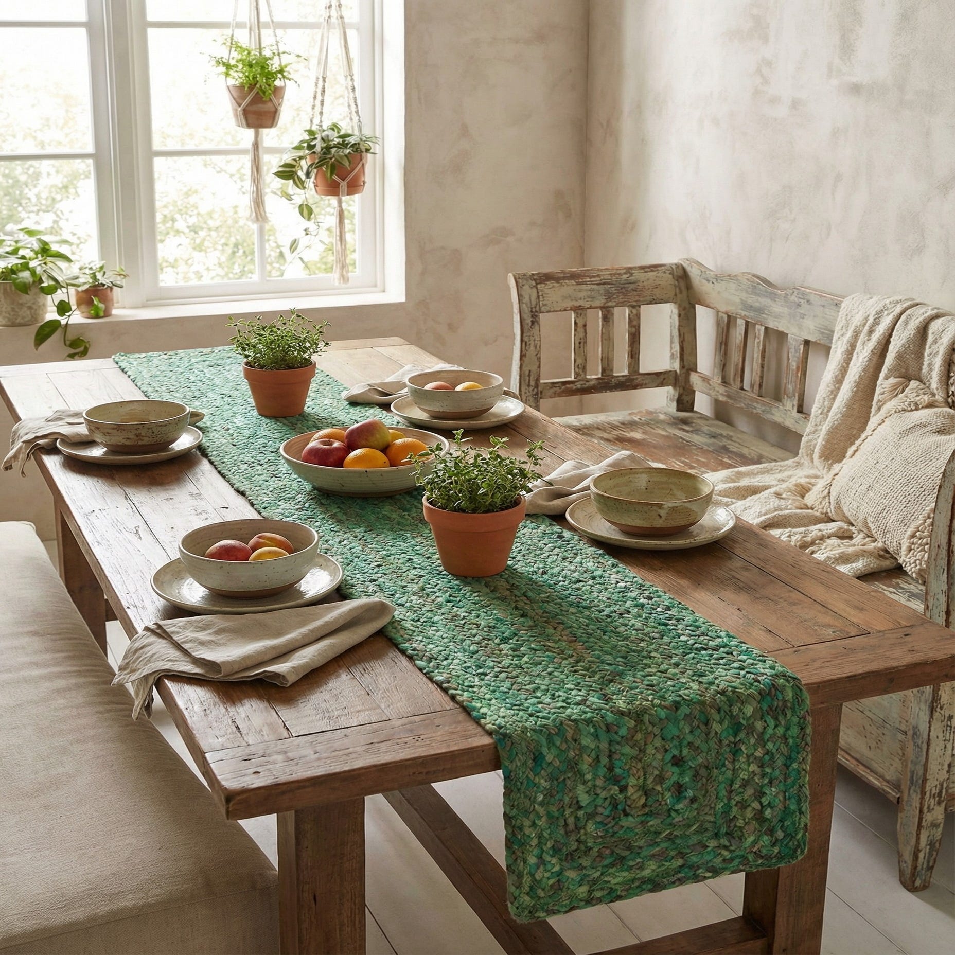 This runner works well in casual, coastal, farmhouse, or bohemian interiors. Pair it with a reclaimed wood dining table and simple white dinnerware for an earthy, grounded table setting, layer it on a narrow console topped with brass accents and a ceramic vase for an inviting entry display, or use it on a kitchen island to introduce color and texture alongside open shelving and woven baskets.