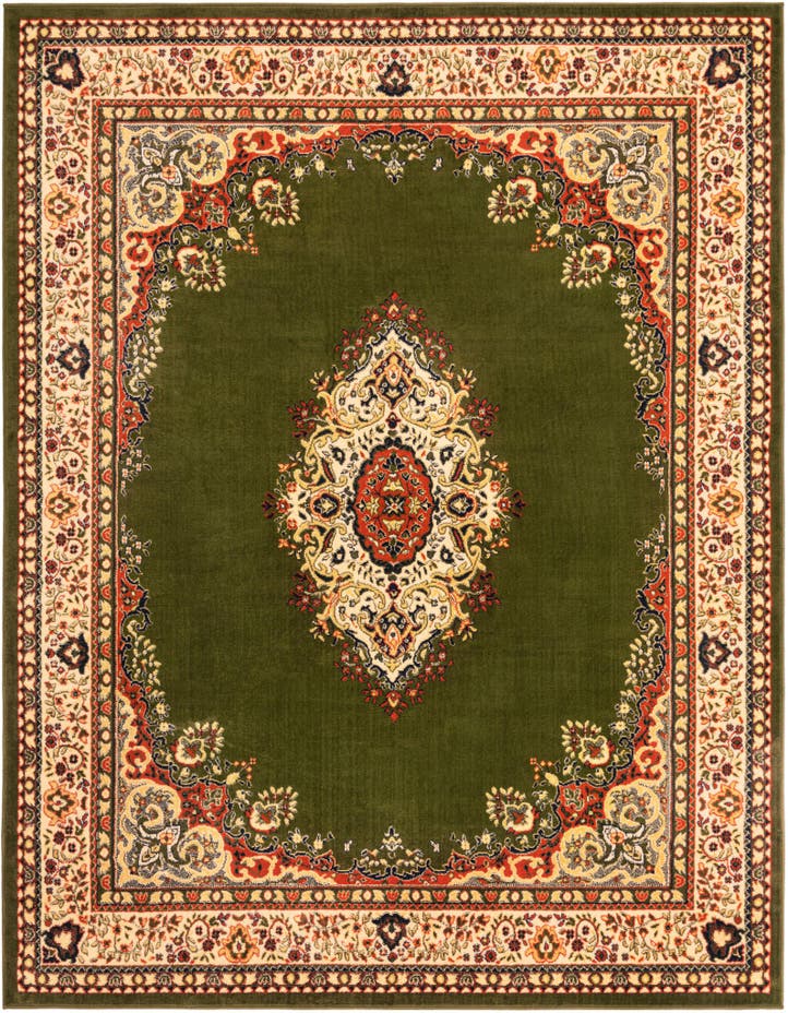 The Amaya collection offers a machine-woven 8x10 rug crafted from 100% polypropylene. This rug presents a plush texture that adds a touch of comfort underfoot, designed to be stain-resistant and shed-free for effortless maintenance. The piece displays a rich green background with a pattern boasting an elegant combination of cream, navy blue, terracotta, and teal hues. The central medallion design, intricate border, and decorative details create a traditional aesthetic that complements a wide range of interior decor styles.