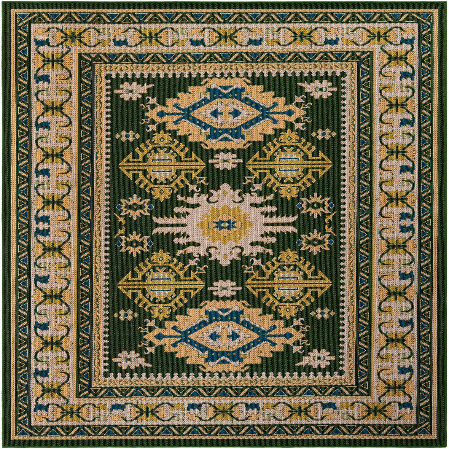 A deep green field anchors a layered medallion and tribal motif layout, where ivory and yellow medallions sit alongside blue accents and subtle touches of pink. Multiple borders frame the center with repeating geometric and floral-inspired bands that give the rug a classic, woven character. Machine made of 100% polypropylene, the rug has a low, flat-woven texture that feels slightly textured underfoot and holds pattern definition with crisp, machine-woven clarity.