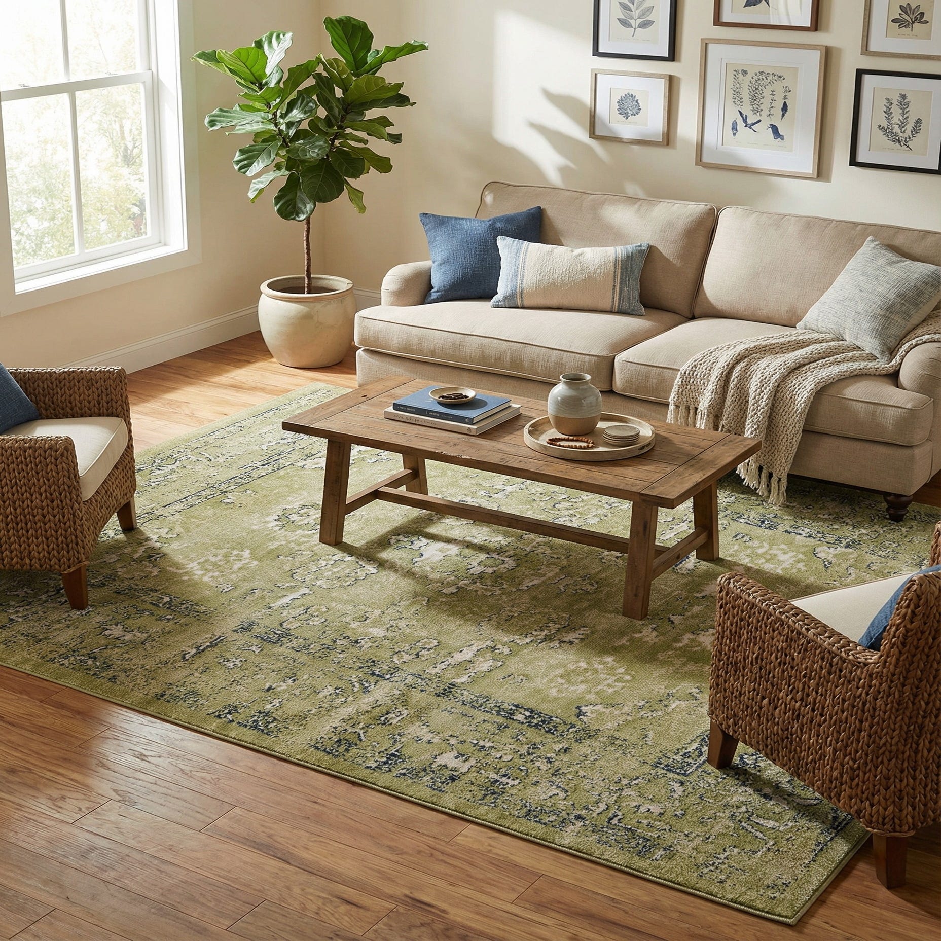 A softened, vintage-inspired medallion floats at the center of a gently distressed field, surrounded by a worn border that gives the rug a lived-in character. The background is a warm green layered with ivory floral motifs and crisp navy-blue accents that outline the design and add depth. Machine-made from 100% polypropylene, the rug has a low, dense pile that feels smooth underfoot and holds a defined surface texture while remaining easy to place beneath furniture.