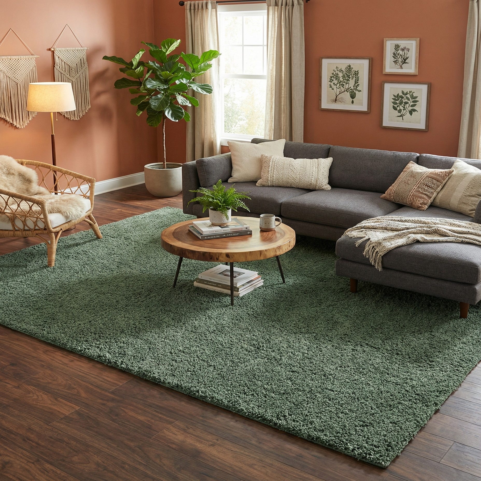 A dense, single-color shag in a soft green creates a calm, grounded presence underfoot. The surface is made up of a generously tufted, high pile that cushions as you walk and shows gentle variation in pile direction for subtle texture rather than a printed pattern. Machine made from 100% polypropylene, the rug has a smooth, even finish with a slight sheen that adds depth to the green tone.