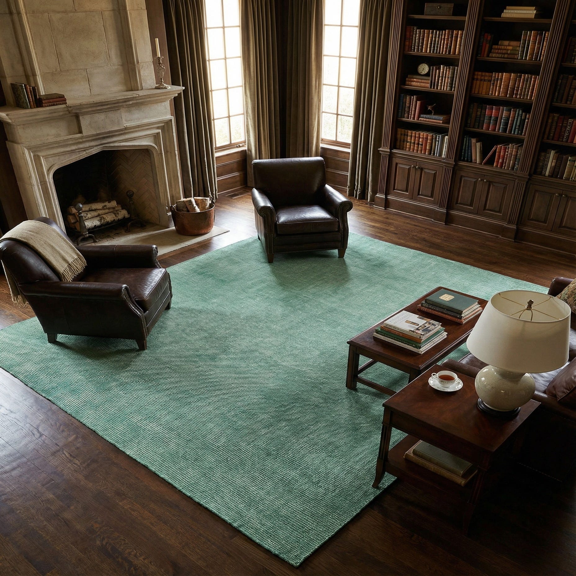 Hand-woven from 100% wool, this rug presents a soft, tone-on-tone green ground with subtle heathering and fine horizontal slubbing that catch the light. The overall pattern is minimal and refined—an even, linear texture rather than a bold motif—so the surface reads as calm and collected while still offering visible depth. The wool pile is dense and low-profile, with a tactile, slightly nubby feel that warms a room without adding bulk.