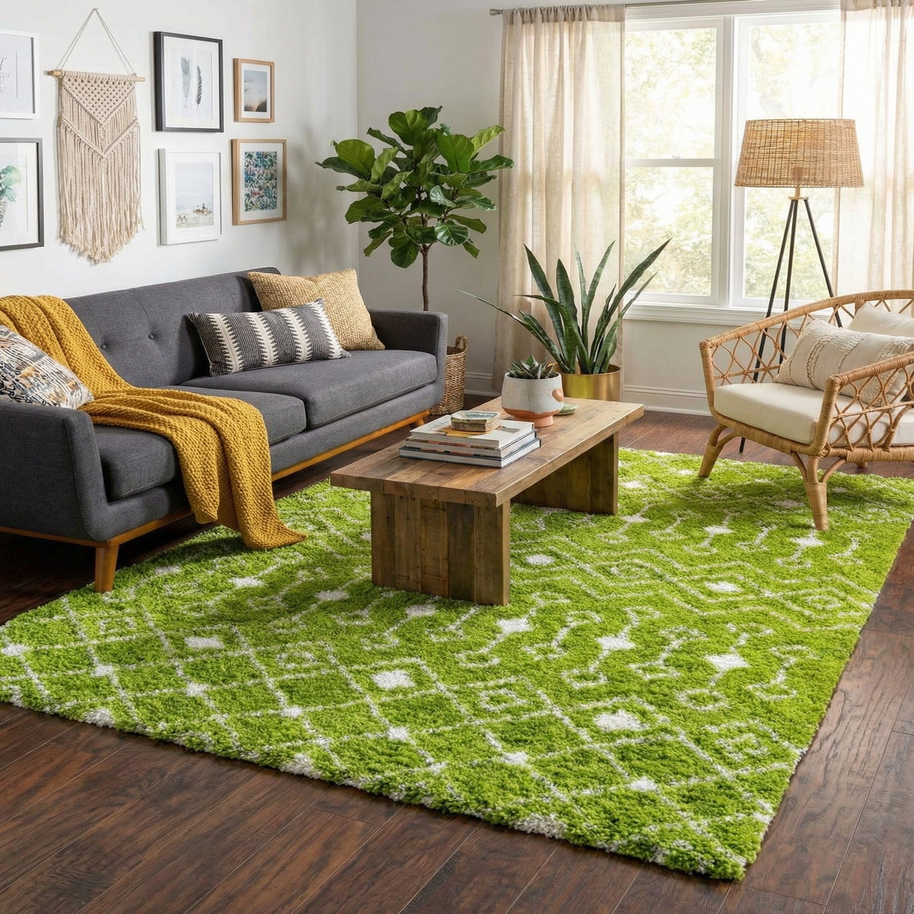 A lively green field provides a striking backdrop for an ivory trellis motif that repeats across the pile. Diamond lattices and stylized medallions create a rhythmic, slightly global-inspired pattern that adds movement without overwhelming a room. The dense shag surface invites touch—the longer polypropylene fibers form a plush, tactile hand and subtle depth where the ivory design rises against the green ground.