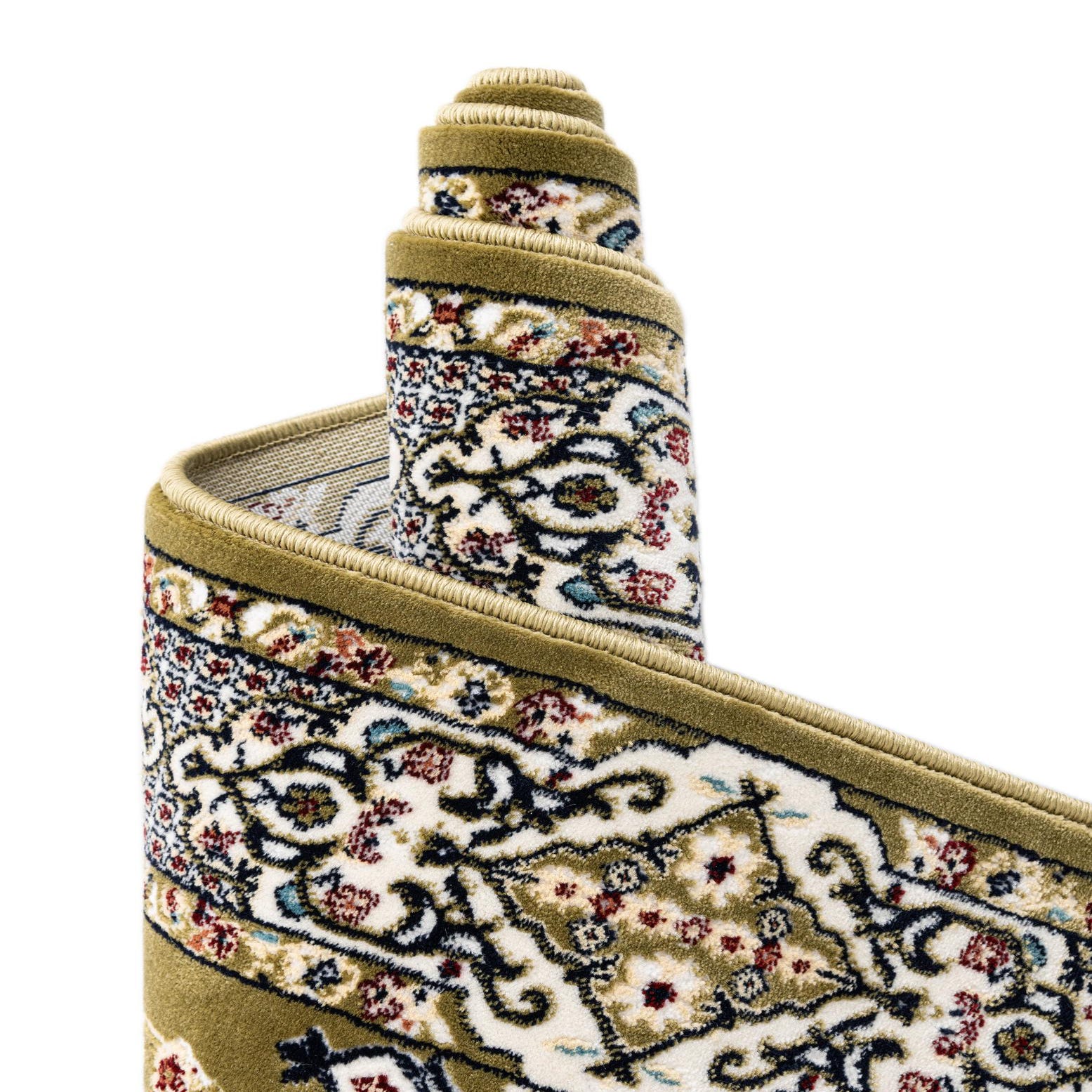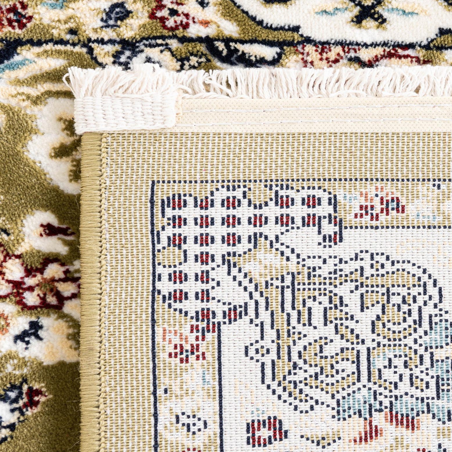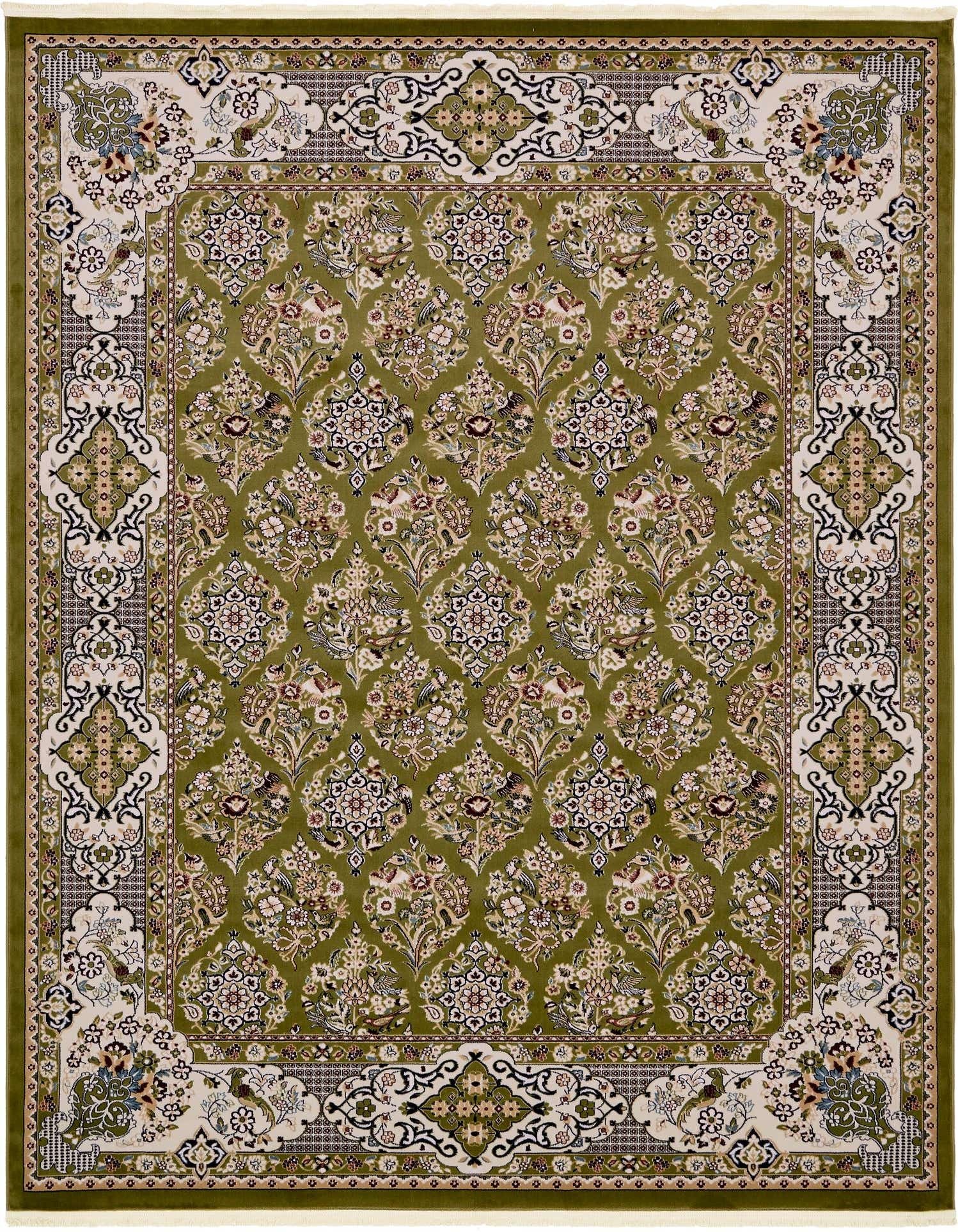 Primary color is Green. Colors in this rug include: Green, Beige, Blue, Burgundy, Cream, Ivory, Navy Blue, Puce.