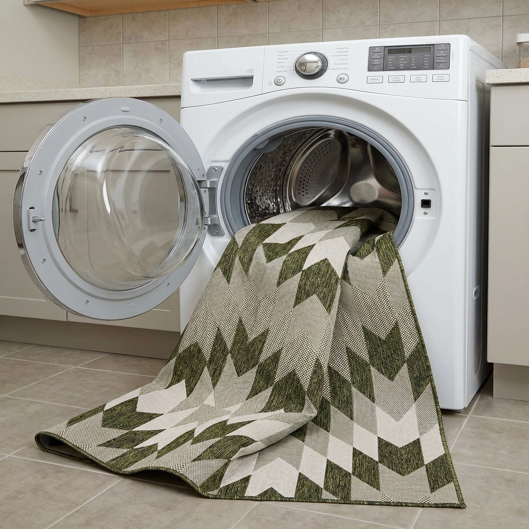 This style works well in outdoor living areas, covered patios, or high-traffic family rooms where a contemporary graphic anchor is needed. Pair it with natural wood furniture and neutral cushions for a relaxed, modern vibe, or use it to add pattern beneath a dining set or sofa grouping in a sunroom or enclosed porch. The green and ivory palette complements warm woods, woven accents and muted metallics for coordinated, layered interiors.
