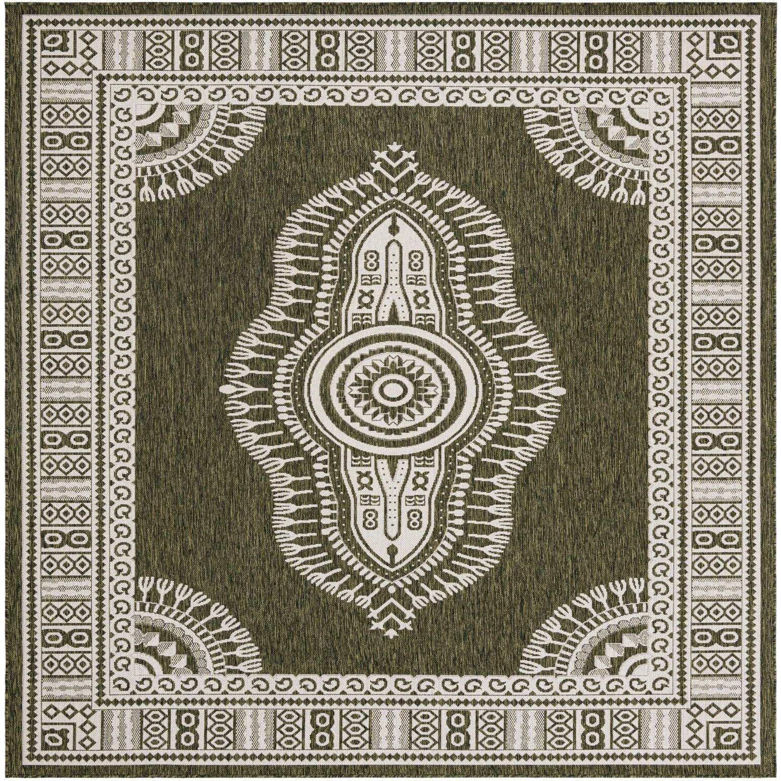 A central medallion and concentric ornamentation give this piece a timeless traditional look with a fresh outdoor twist. A rich green field provides a deep, grounding backdrop for the crisp cream motifs — a finely detailed round medallion at the center, scalloped spandrels in the corners, and a layered geometric border that alternates small diamonds and linear bands. The pattern balances classic Persian-inspired forms with simplified, graphic detailing for a look that pairs well with both classic and contemporary furnishings.