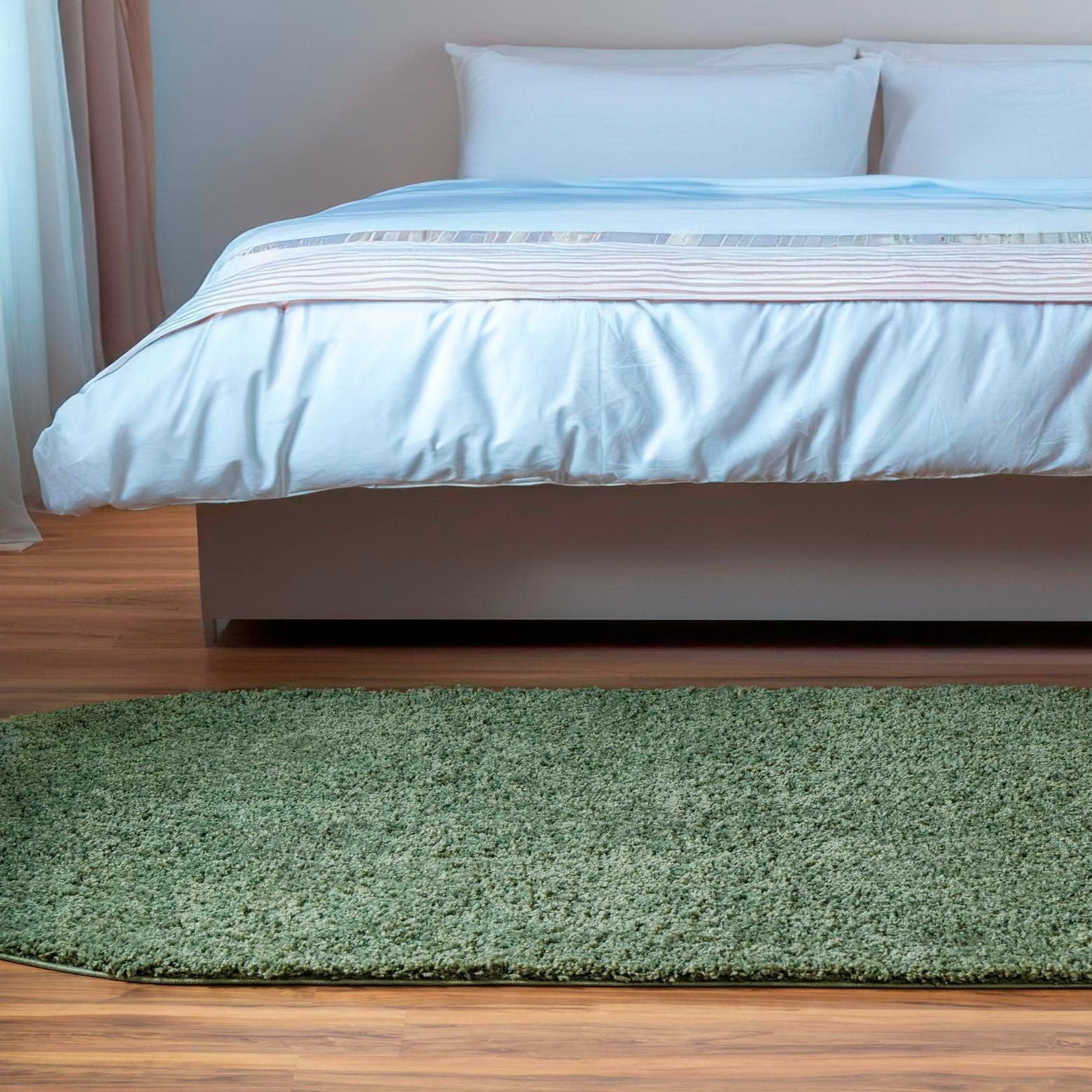 A low-contrast, solid green shag with an oval silhouette, this rug brings a tactile layer of warmth to a room. Machine-made from 100% polypropylene, the long, dense pile creates a plush, cushiony surface that compresses softly underfoot and returns to its loft with light movement. The uniform green background shows subtle tonal shifts where the fibers catch the light, giving the surface depth without a busy pattern—clean, simple and textural.