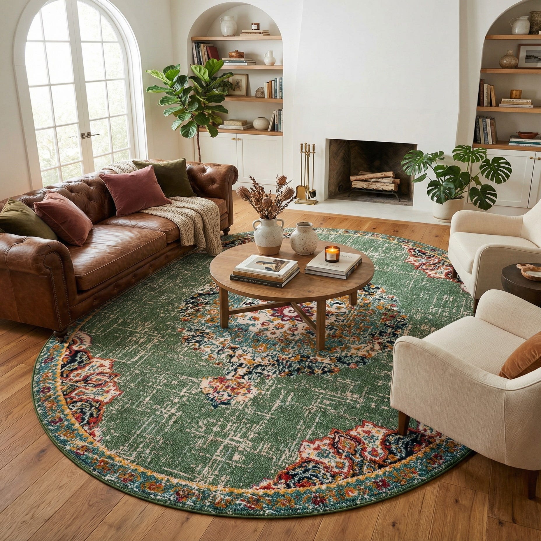Machine-made of 100% polypropylene, the rug has a low pile that feels smooth and slightly dense underfoot, with a finely defined pattern that holds color well. The oval shape makes it an easy choice to tuck under a round dining table, center beneath a seating group, or anchor a foyer or reading nook. Pair it with warm wood furniture and neutral upholstery for a cozy, layered look, or layer it into an eclectic scheme with brass accents, woven textiles and patterned throw pillows for a livelier, collected atmosphere.