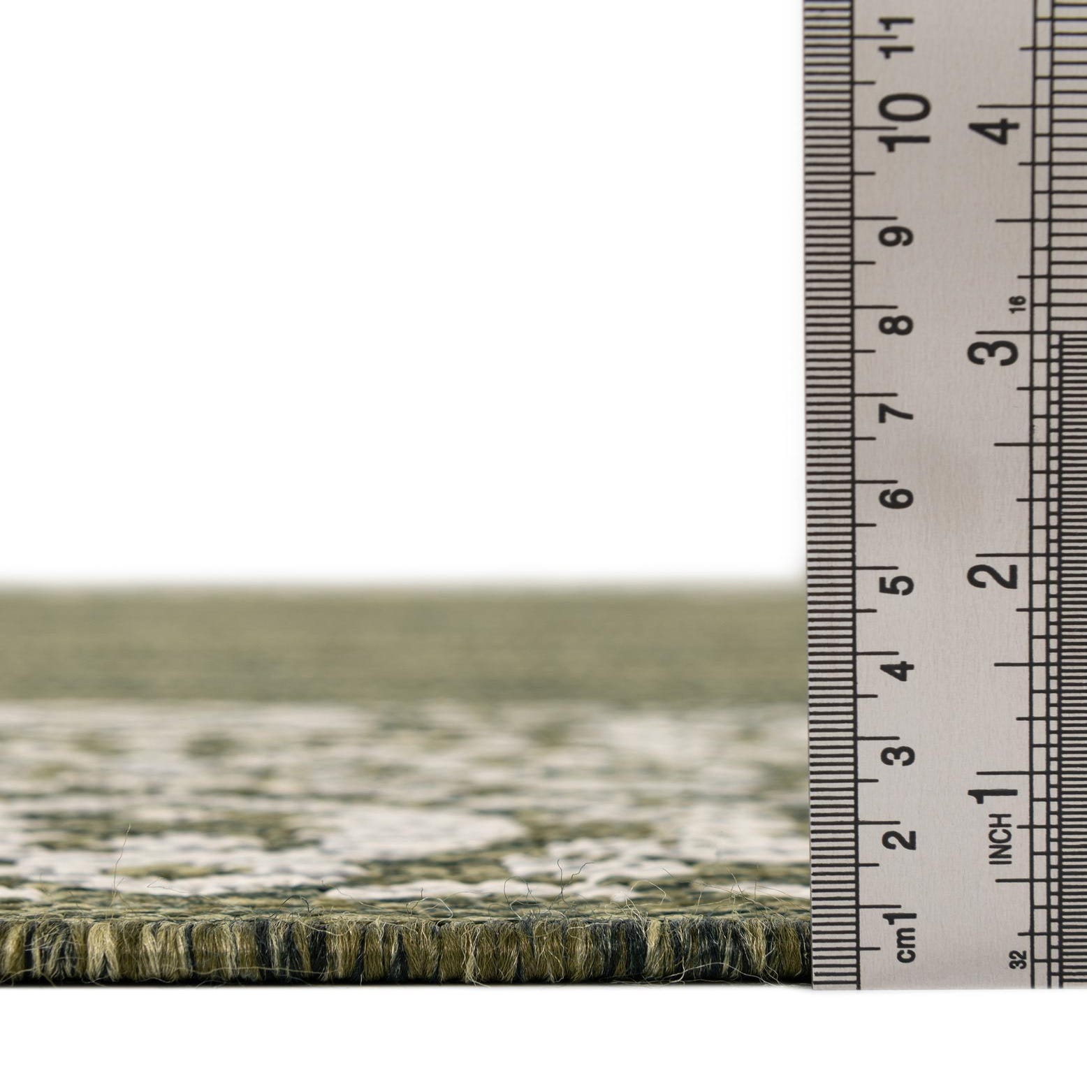 Machine-made from 100% polypropylene, this oval rug presents a grounded green field with a subtle striated weave that gives the surface a gentle, textured feel underfoot. An ivory border detailed with gray scrolling motifs frames the center, offering a refined, slightly weathered look that balances classic ornament with a casual, outdoor-ready aesthetic. The low-profile pile and tight construction read smooth and substantial to the touch, while the muted color mix keeps the pattern readable without competing with other decor.