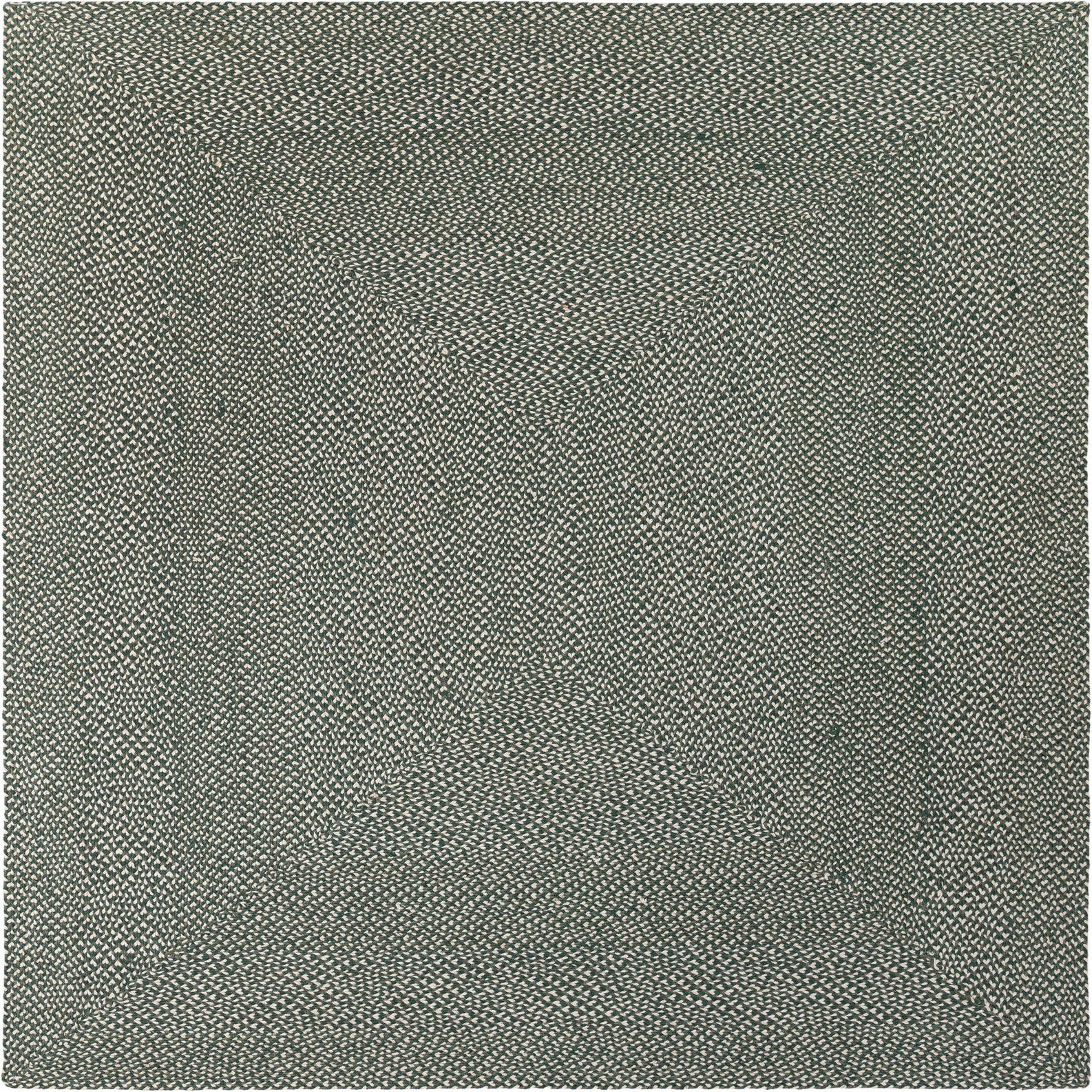 Hand-braided from 100% jute, this rug has a closely woven, tweed-like braid that gives it a refined, tactile surface. The green background is interlaced with ivory and gray strands, creating a subtle, salt-and-pepper effect and gentle tonal movement across the field. Braided rows are arranged to form a framed, concentric pattern that adds quiet geometric structure without overpowering a room. Underfoot the natural jute fibers feel firm with a textured, hand-crafted finish that highlights each braided loop.