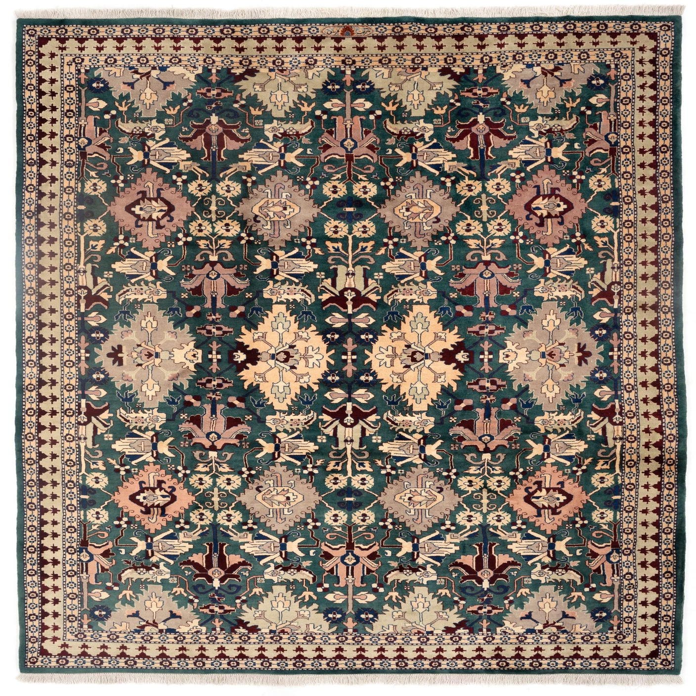 The Indo Tabriz collection presents a hand-knotted rug crafted from 100% wool, offering a durable and tactile surface. This 8x11 rug features a sophisticated green background, which elegantly supports the intricate pattern work that is traditional of Tabriz designs. The pattern includes a harmonious blend of red, blue, cream, and beige motifs, which create a tapestry of ornate floral and geometric shapes.