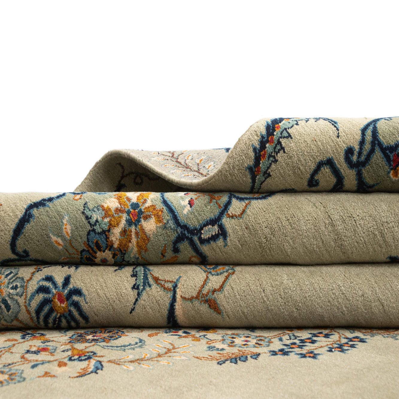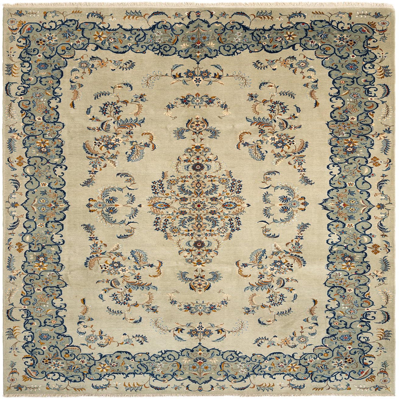 An 8x11 rectangular Kashan Persian rug with a light green field, intricate blue and gold floral patterns, and a detailed border.
