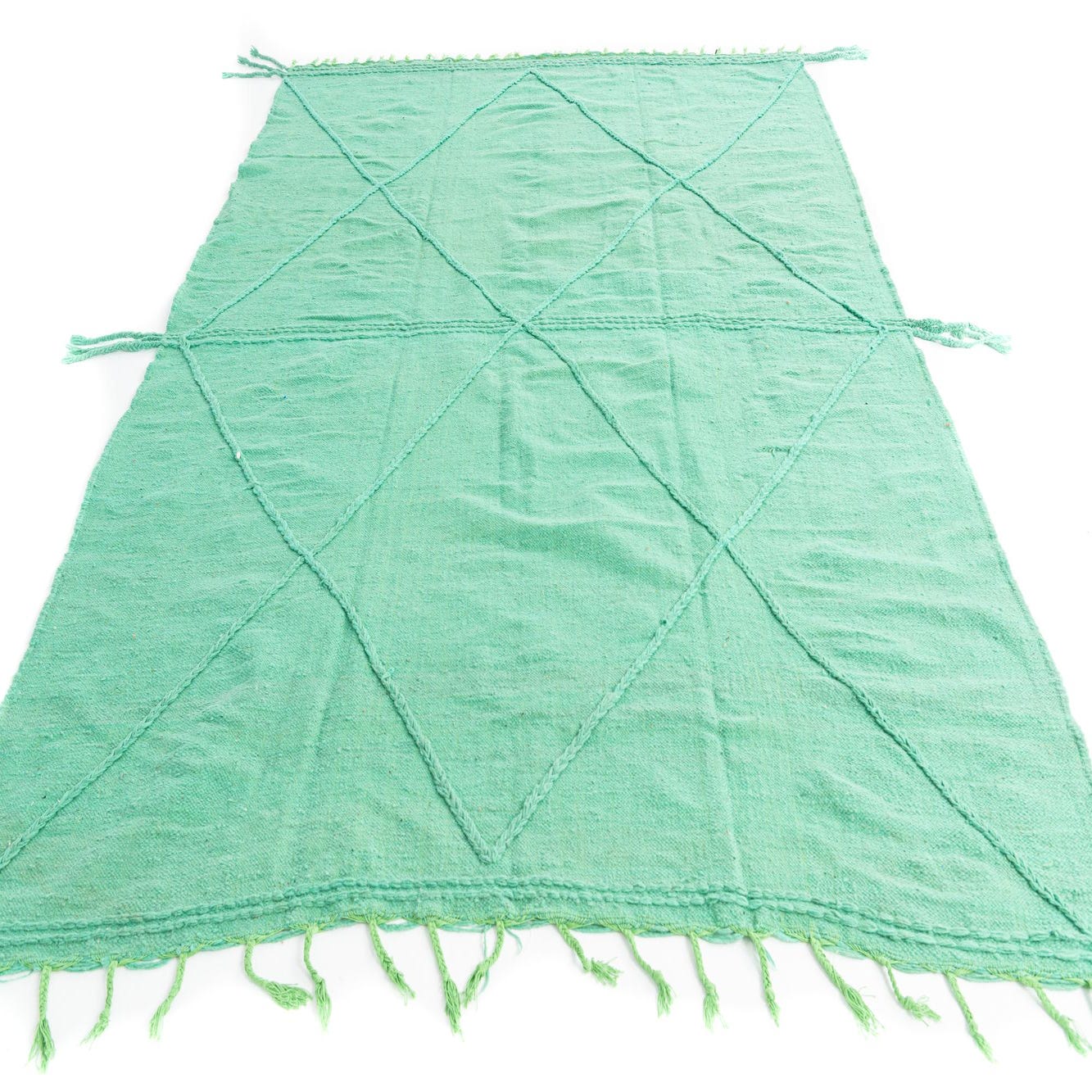 This Moroccan collection rug, measuring 8x11, is a hand-knotted piece crafted with 100% wool, offering a tactile experience underfoot that is typical of high-quality wool textiles. The rug's background is a vibrant green hue, providing a bold splash of color that can act as a focal point or complement existing décor. Boasting a semi-antique age of 40-60 years, it presents a timeless charm with a simple yet striking geometric diamond pattern that exudes a sense of Moroccan heritage and craft.