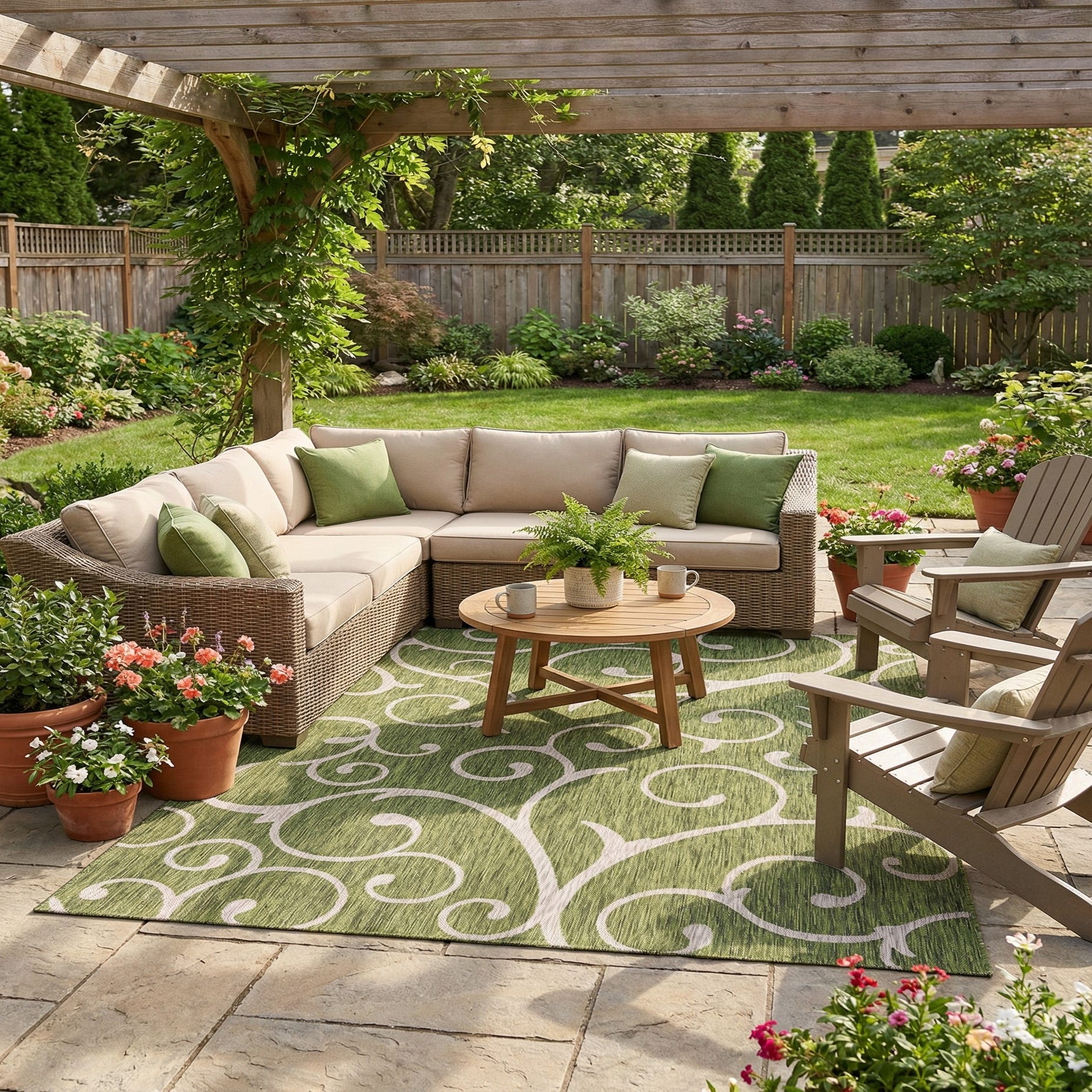 This rug pairs easily with natural materials and relaxed seating: think teak or wicker patio furniture, linen slipcovers, or white-painted wood for a garden-inspired porch or sunroom. It also works well as an anchor for a casual dining area or an indoor-outdoor living space, complementing both contemporary and transitional palettes that favor green accents and neutral furnishings.