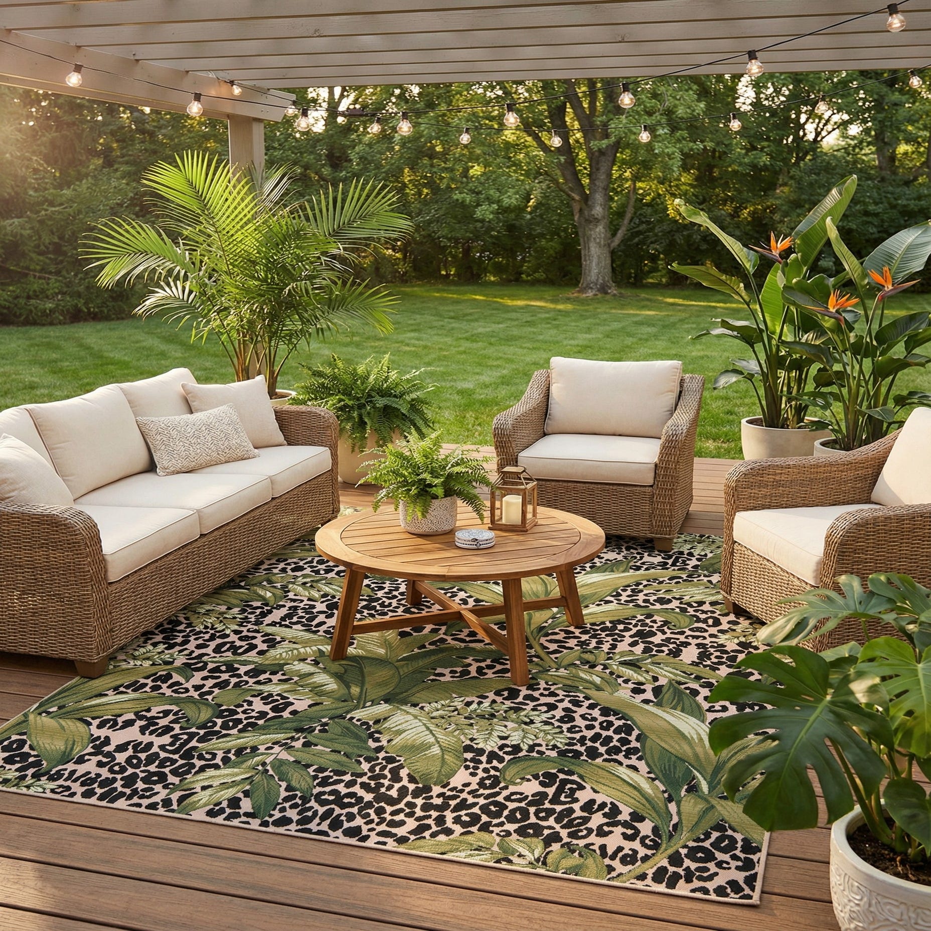 This rug would best complement an outdoor patio, deck, or sunroom, where its botanical motif can seamlessly integrate with garden elements. It could also serve as a statement piece in a minimalist or tropical-themed indoor space, where its natural color palette can create an inviting and cohesive look. The rug's resistance to the elements and versatile design make it suitable for a variety of decor scenarios where a blend of style and function is desired.