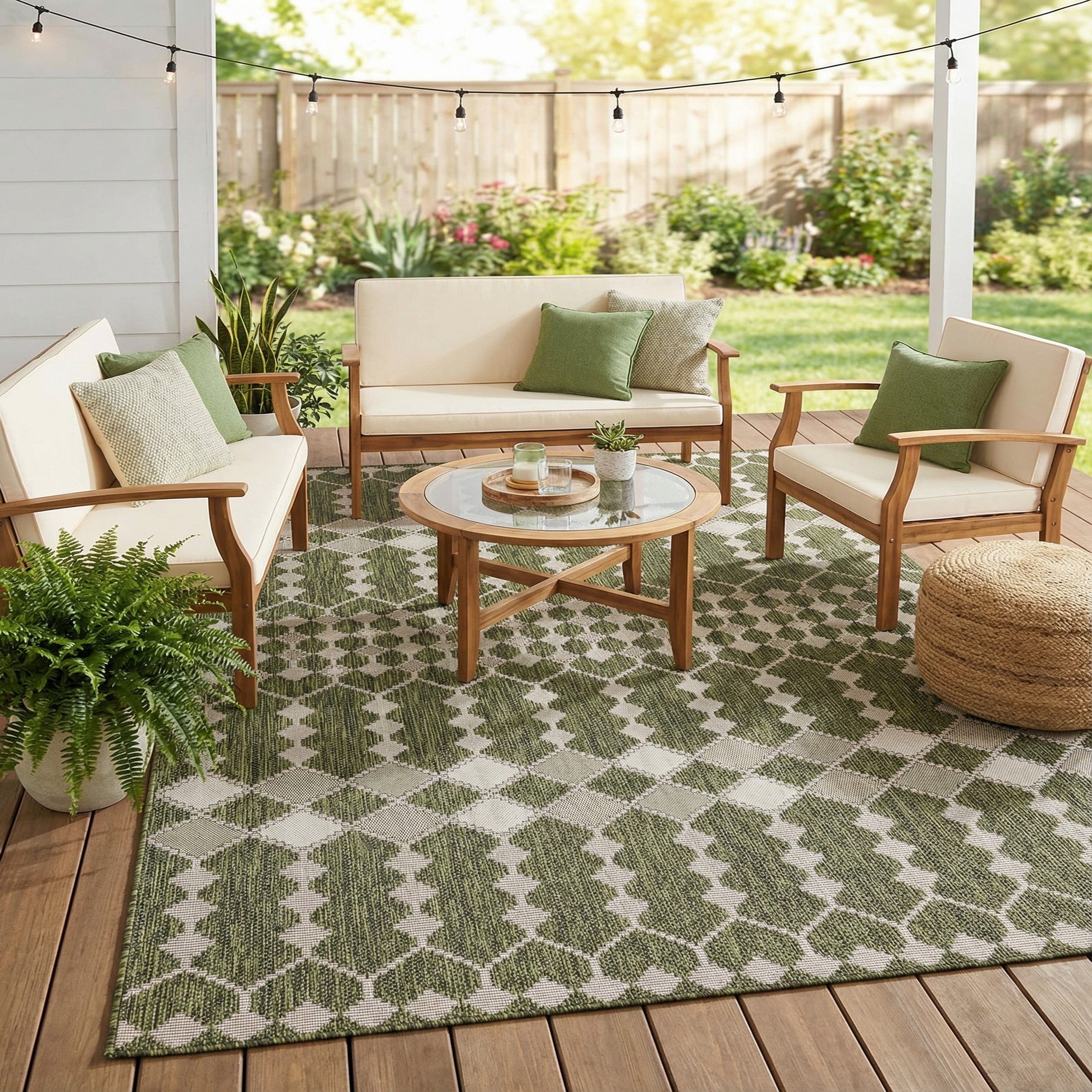 An 8x11 rectangular green and white outdoor rug with a modern trellis pattern, suitable for a patio or living room.